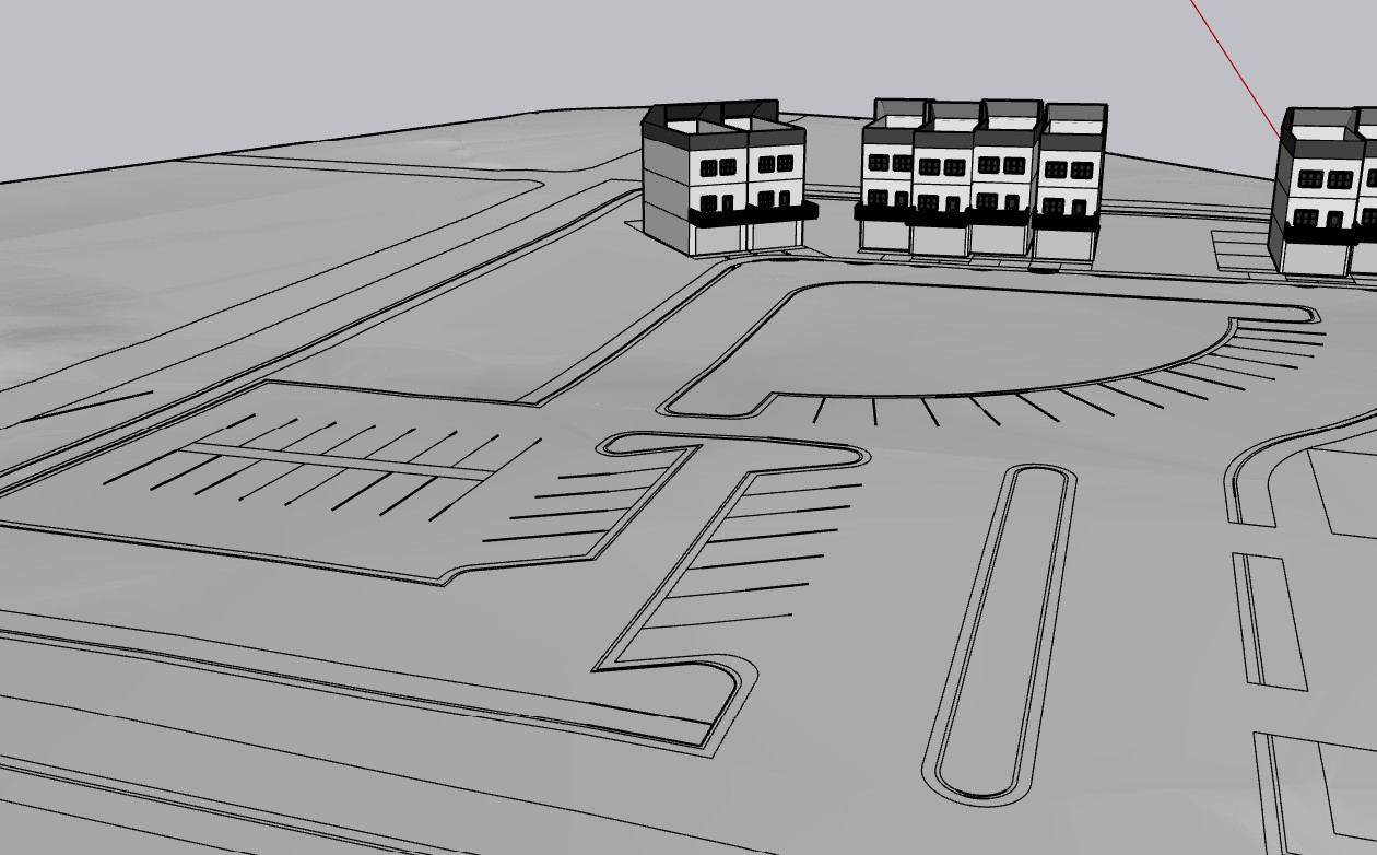 manicured lawns in front of these townhomes tallish grass each townhome needs to be wood light wash with a darker brown roof there is an outlined driveway infront of eachtownhomes garage and infront of the row of townhomes there is an outlined sidewalk and road the plantings need to be yellow green flowing trees south georgia type plant the central open area that is outlined near the upper rightside of this photo is an outlined dogpark with parking around it there is outlined parking spaces in the lower left side and the long verticle thing in the lower right side of the photo is meant to be a divider from the entrance exit side of this opening in the road it should be a line of plantings dark shrubbery and the background should be a downtown city scene