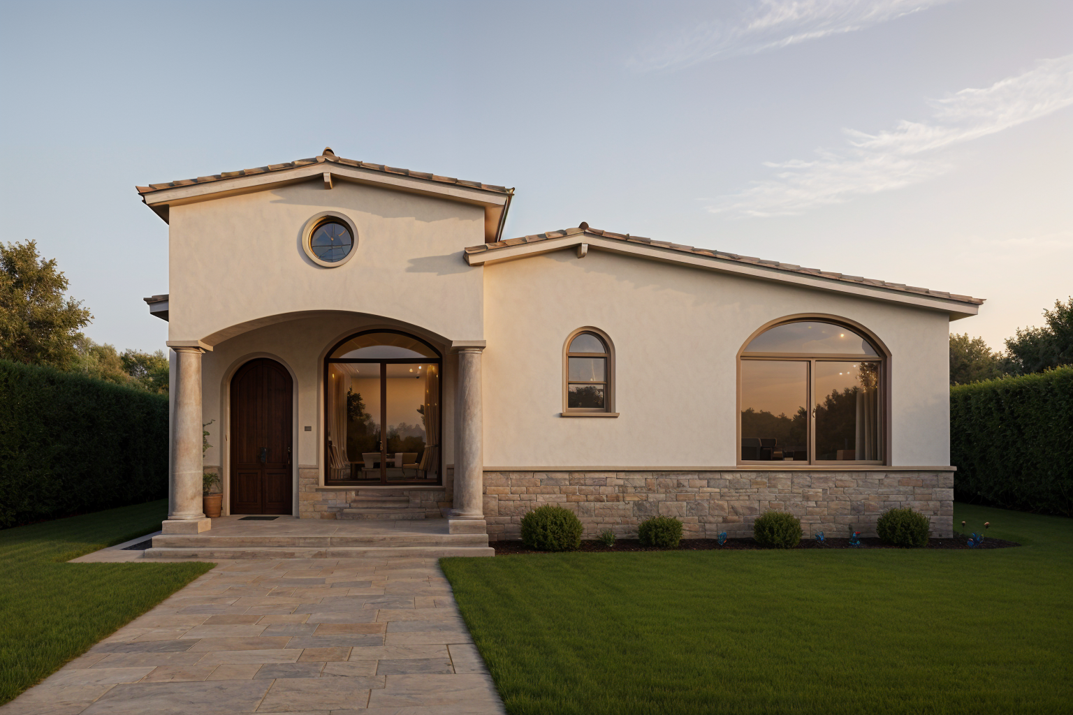 render a charming farmhouse with a modern touch the building should have bright white metal siding and a black metal roof the porch is adorned with warm light wood accents windows are large and inviting with a clear reflective glass finish the doors are a classic white set the atmosphere in a serene sunny afternoon with a soft blue sky and gentle diffused lighting casting warm shadows surround the scene with lush green grass and a few tall trees in the background