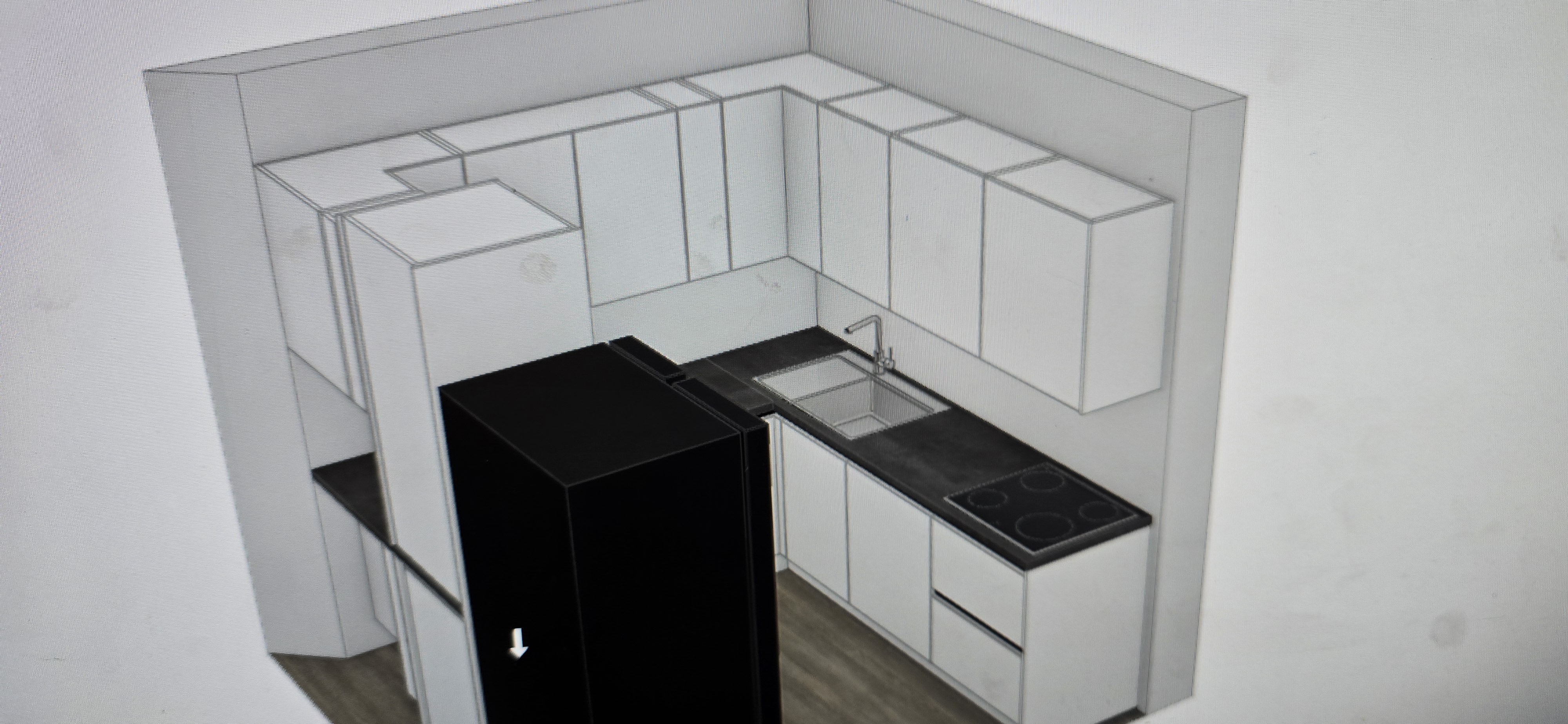 a modern kitchen design with sleek white matt cabinets contrasted by a black refrigerator and countertops the floor is a warm light oak wood adding a touch of natural warmth appliances are subtly integrated in white mat and silver tones creating a seamless and clean look the atmosphere is bright and inviting with soft ambient lighting that highlights the smooth surfaces and modern design elements the sink area features a stainless steel finish enhancing the kitchen s contemporary aesthetic