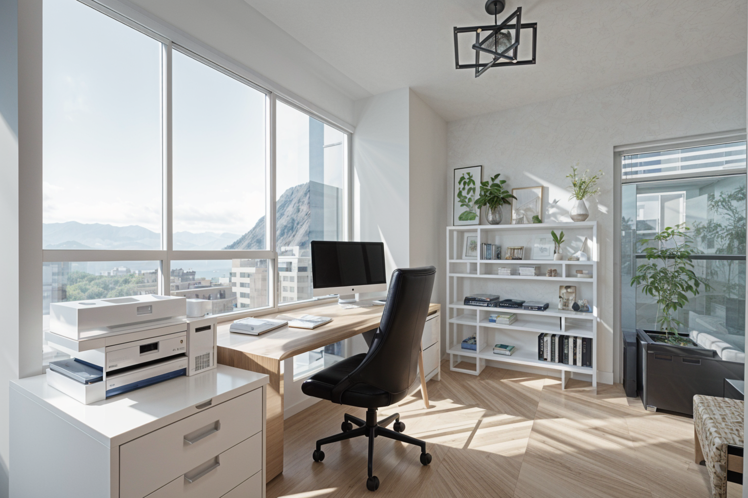 modernist interior shot contemporary home office in a suburban bc house built in shelves with books and decor sleek desk with dual monitors cozy area rug west coast modern style with wood and stone finishes bright and airy with natural daylight architecture