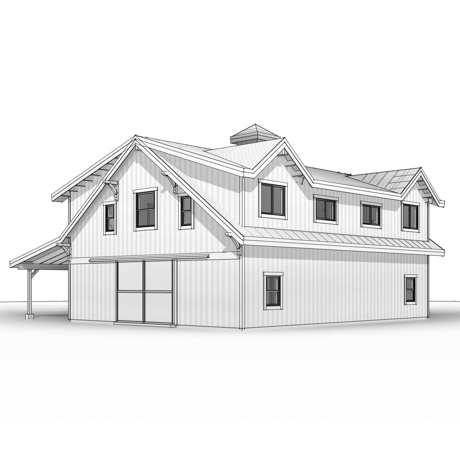 a timber clad residence with pitched roofs and a wood clad cupola cinematic day time lighting with warm interior glow photorealistic render soft atmospheric contrast gravel foreground expansive sky mountains in background clean contemporary composition