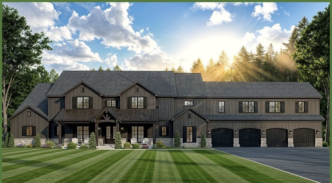 change the roof to vertical black steel roofing and change the siding to brown vertical board and batten steel siding