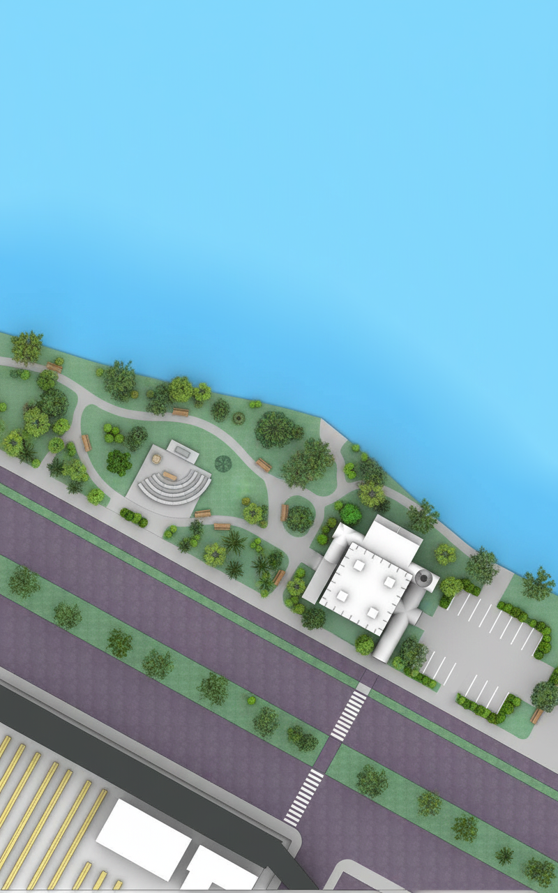 do not change any existing geometry create a photorealistic architectural exterior rendering of this site the reference image is what the building looks like at eye level