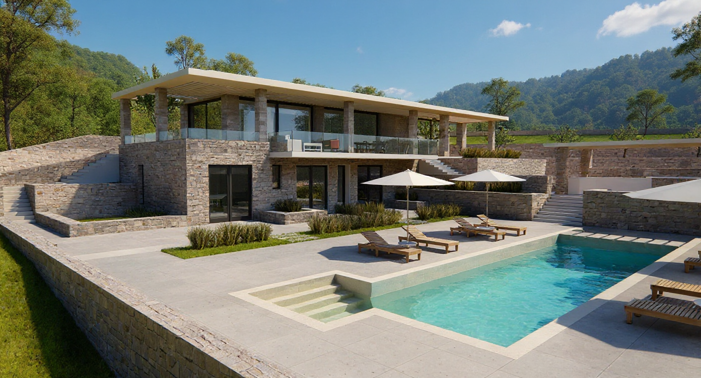 trees and bushes on the perimeter few small house on the background soft lights clear sky with some clouds light gray color on the wood parts of the roof