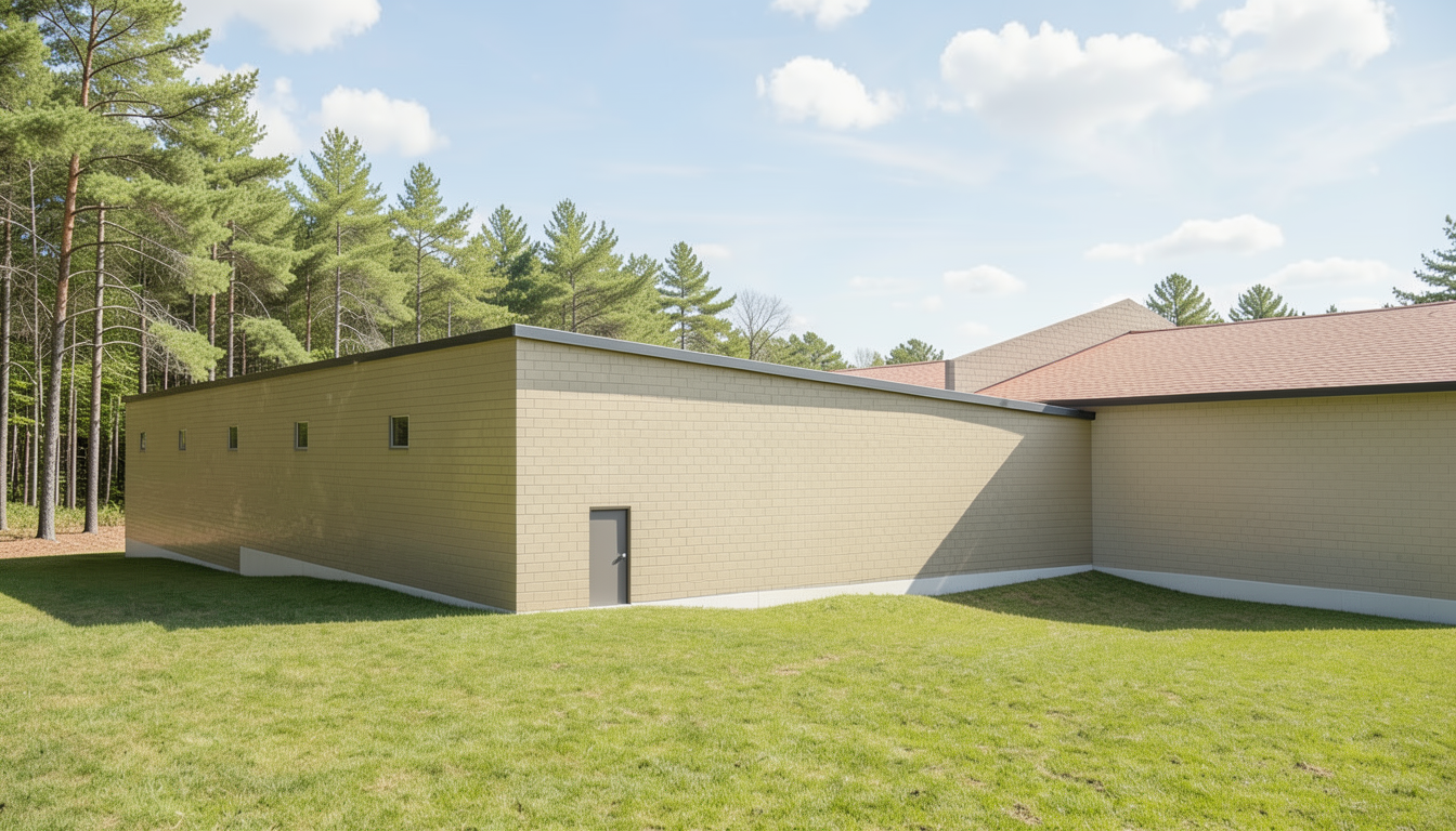 modernist exterior shot a serene japandi style bedroom interior warm natural wood tones custom built in wooden wardrobes with arched niches vertical slatted wood details minimal and elegant design a low wooden bed with soft beige bedding textured throw blanket and a wooden four poster canopy bed with sheer white curtains flowing gently floor to ceiling windows with soft daylight filtering through sheer curtains calm and cozy atmosphere dark wooden floor neutral color palette organic textures minimalist luxury ultra realistic interior render soft global illumination cinematic lighting high detail 4k photorealistic interior visualization v ray corona style render architecture