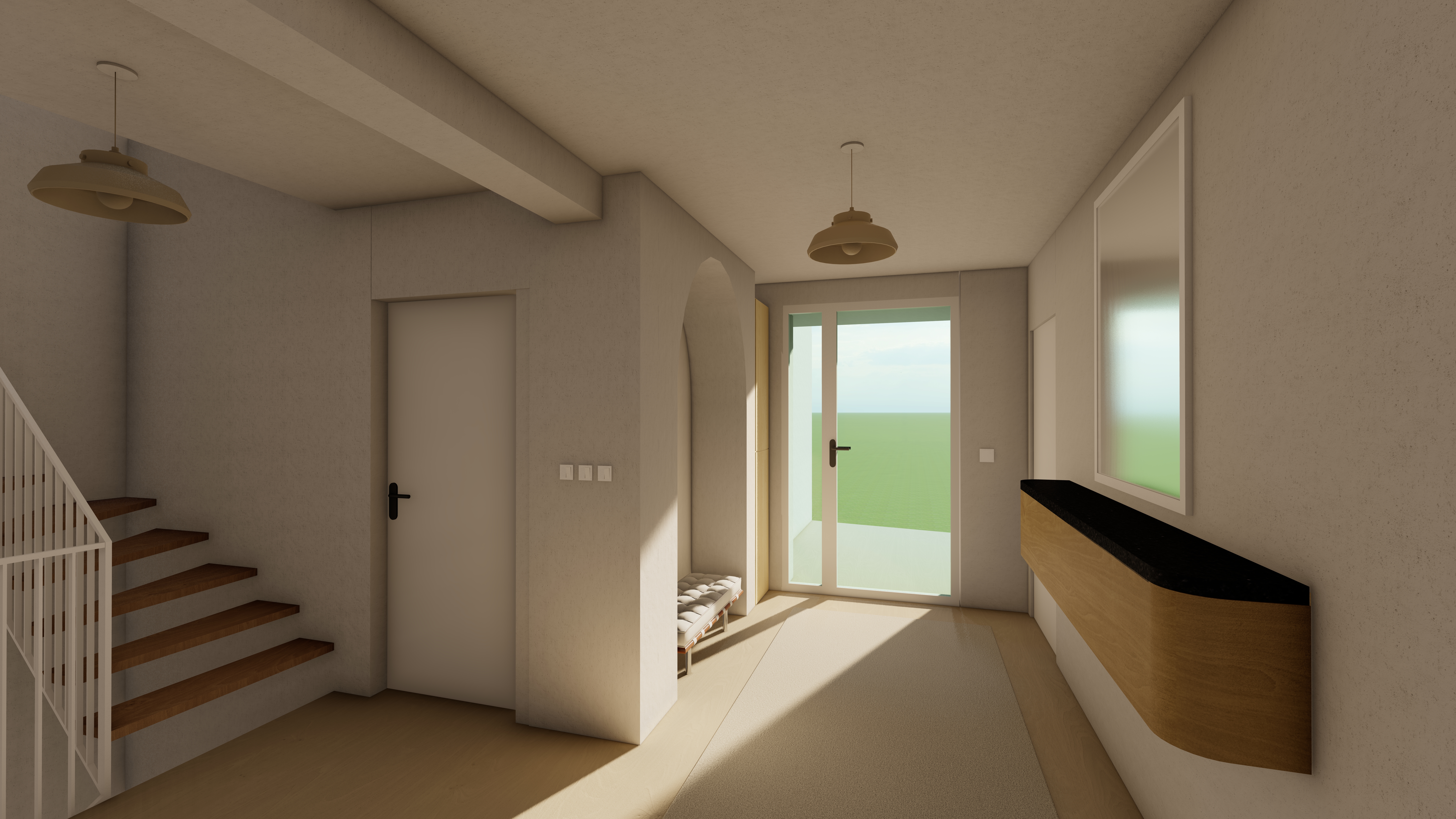 make the atmosphere warm and bright on the other side of the glass entrance door place a front facing car on the right with an urban background and a hedge behind it add a plant on top of the cabinet on the right which must remain unchanged