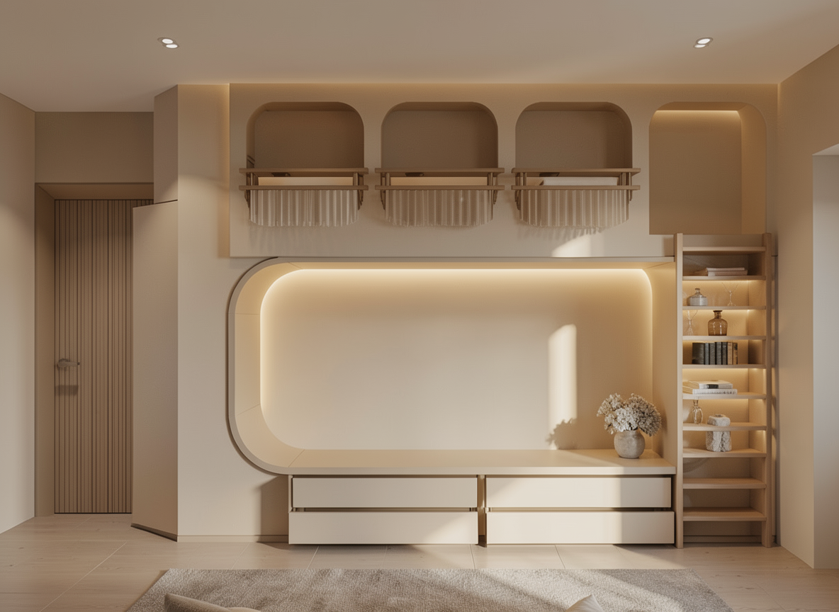 beige interior design subtle led lighting oak wooden flooring