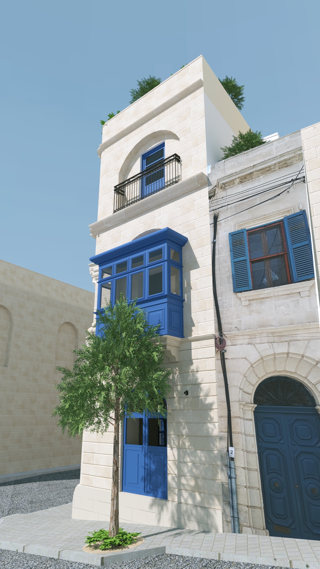 exterior shot make it slightly realistic 118 years old just reinstated as original maltese house corner with statue of madonna carved to stone architecture
