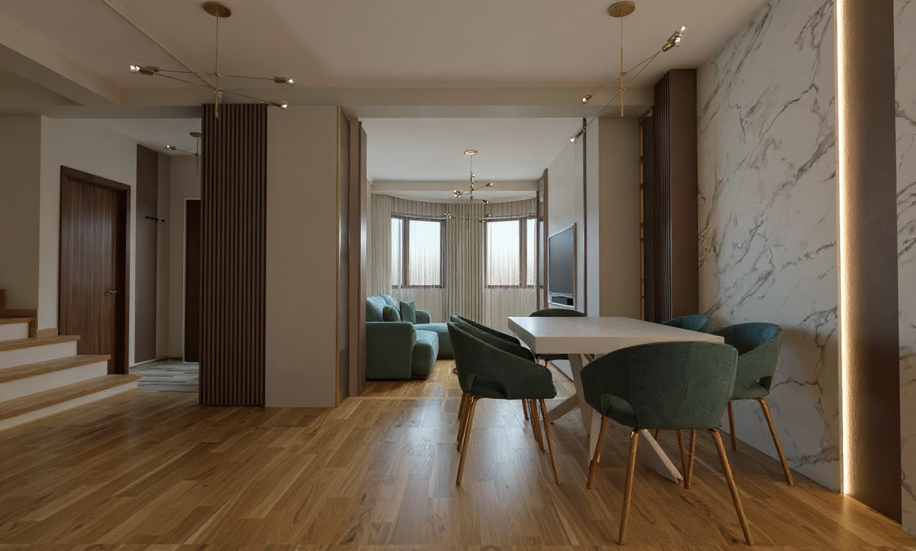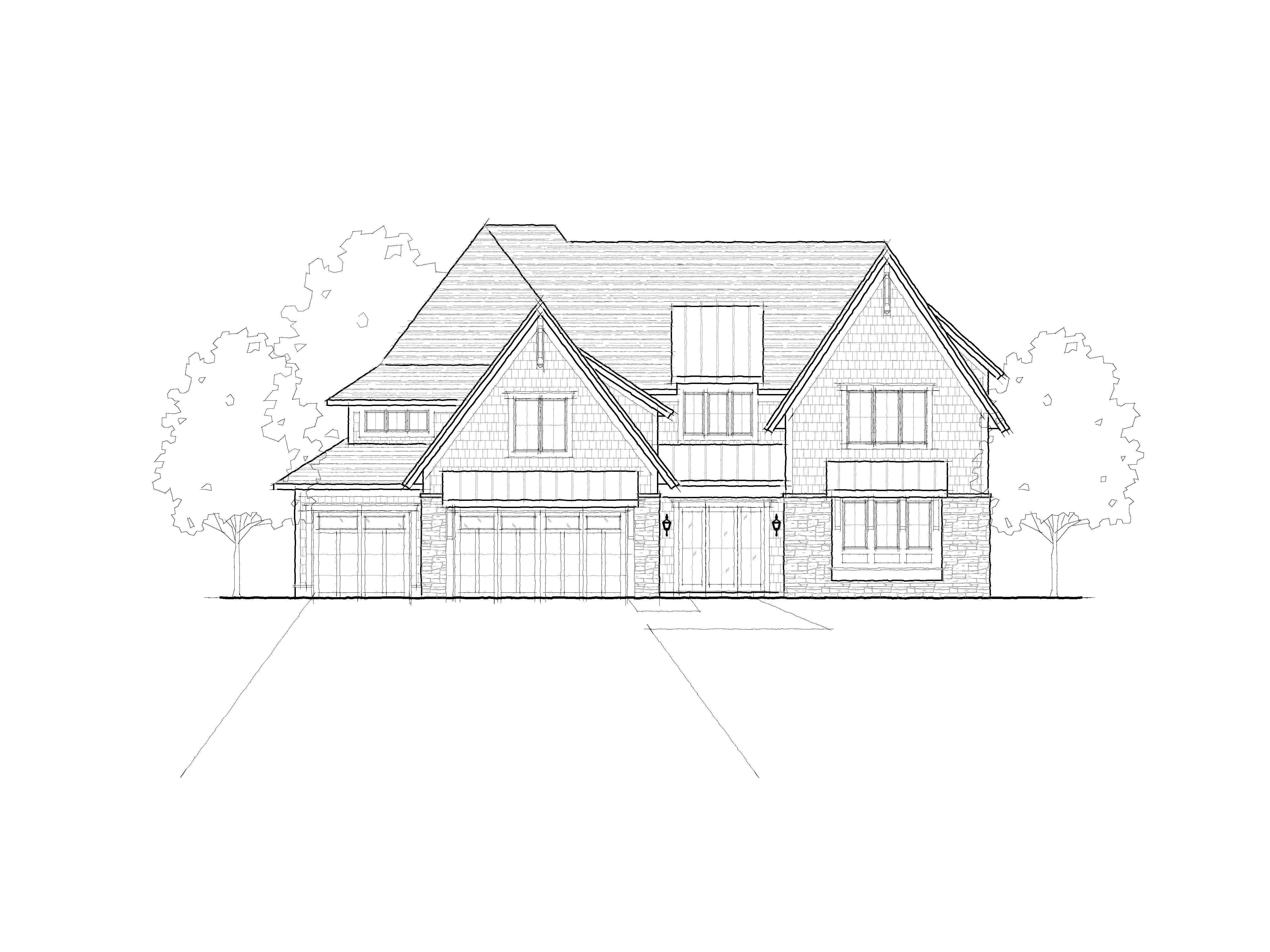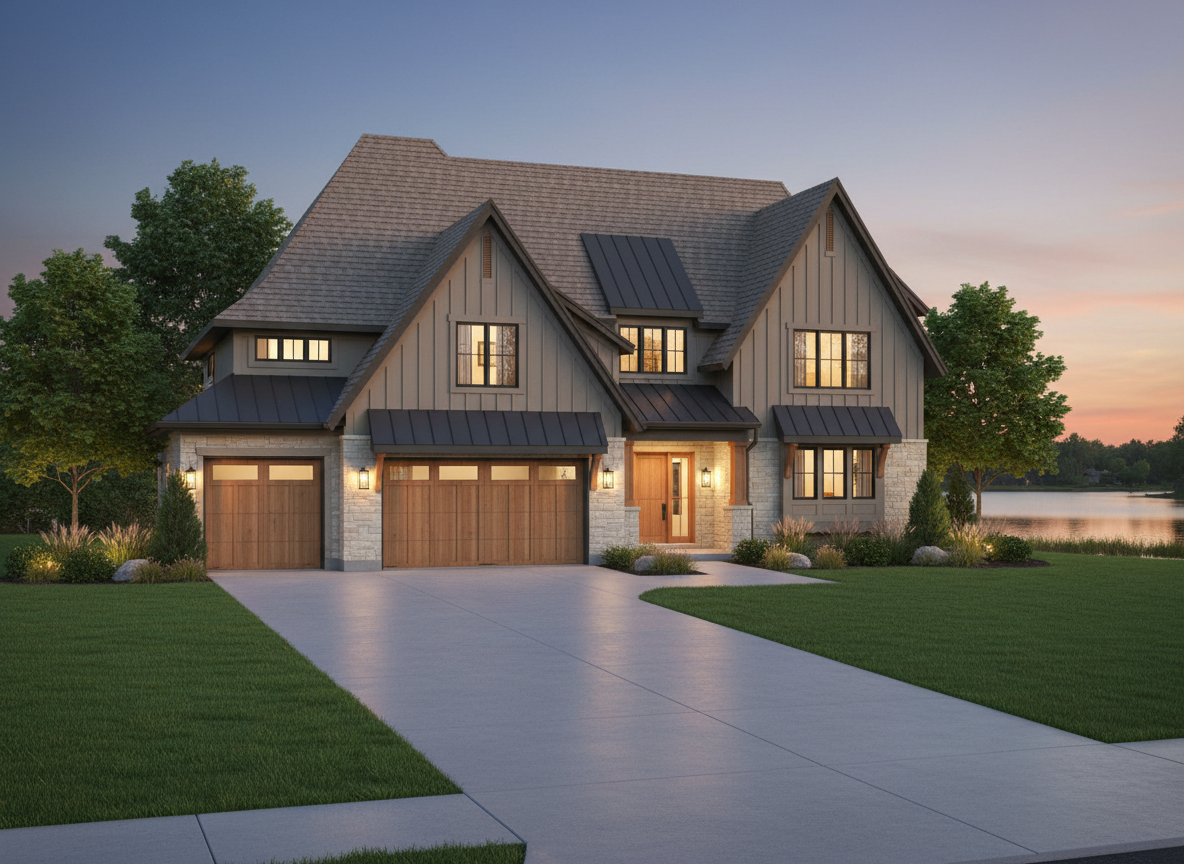 create a high end photorealistic 3d exterior architectural rendering inspired by the reference image match the architectural style proportions materials and color palette exactly set during early evening dusk design a two story modern craftsman transitional luxury home with multiple steep front facing gables and balanced massing exterior materials include warm greige vertical board and batten siding light cream limestone stone veneer on gable faces and lower walls and a soft taupe architectural shingle roof with dark trim accents include a charcoal or dark bronze standing seam metal roof accent over the garage volumes and select lower roof planes clearly distinct from the shingle roof above windows feature black or dark bronze frames with tall clean proportions garage doors are warm natural wood with subtle horizontal detailing and upper glass lites front entry includes a covered porch with wood posts stone base columns and a warm wood front door add a smooth light gray poured concrete driveway and concrete sidewalks with clean edges and subtle control joints set the home in a summer environment with lush green lawn finished landscaping manicured shrubs ornamental grasses and small deciduous trees in full leaf in the background include a calm natural lake with subtle reflections soft shoreline vegetation and distant trees visible but not overpowering the home evening lighting soft blue hour sky transitioning to warm sunset tones near the horizon interior lights glowing warmly through windows exterior architectural lighting at the entry and garage casting soft realistic pools of light gentle reflections on the metal roof and lake surface camera angle is straight on to slightly angled front elevation at eye level materials should remain crisp and realistic with balanced exposure no harsh contrast ultra realistic architectural visualization warm inviting premium residential evening atmosphere