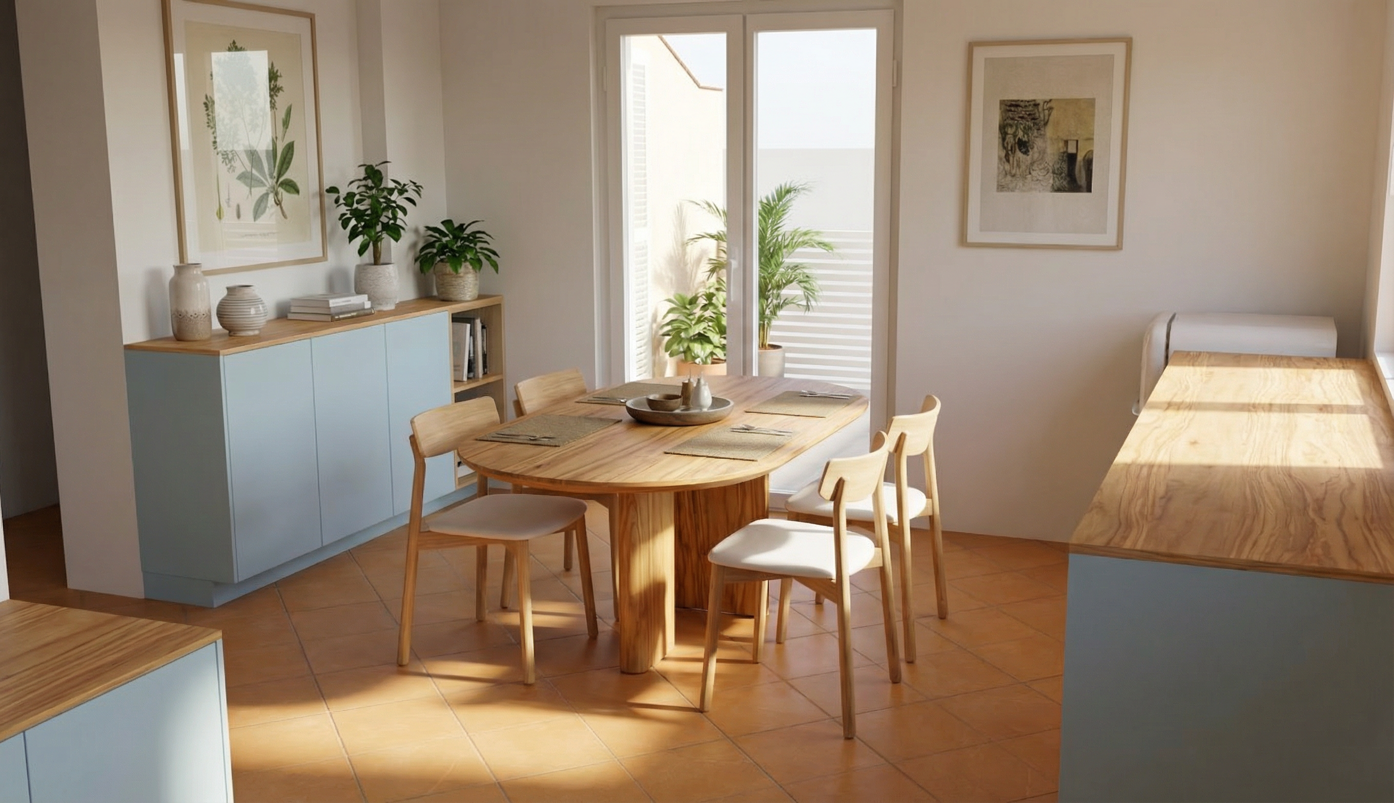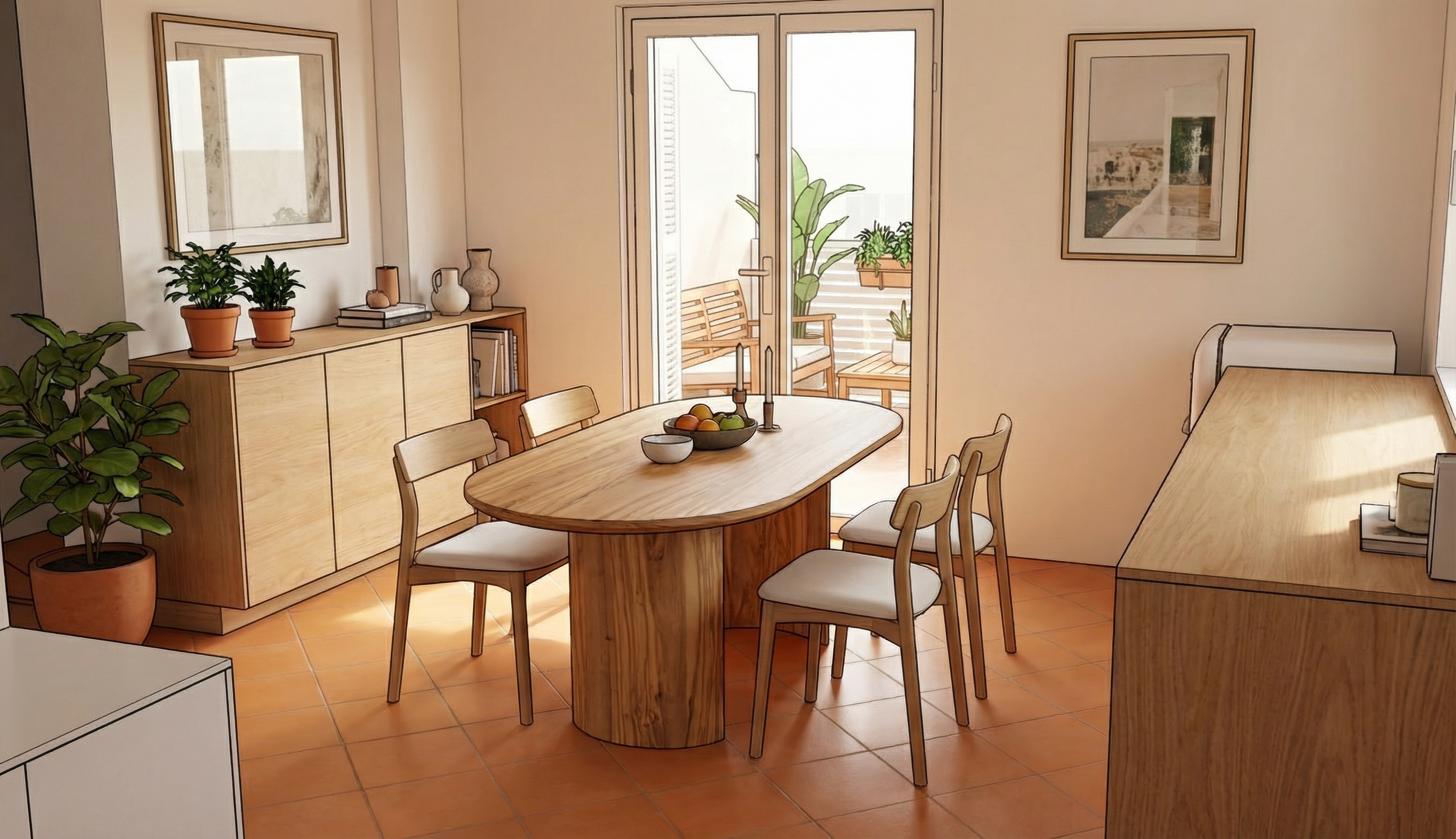 add round table for 4 for outside with 4 chairs make roof look like roof and make balcony look like mediterranean style and make it look new with white facade and maybe little bit of blue