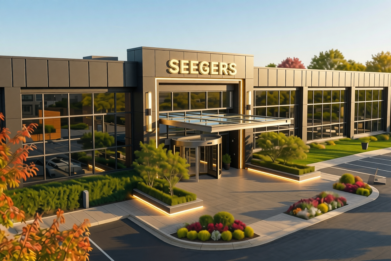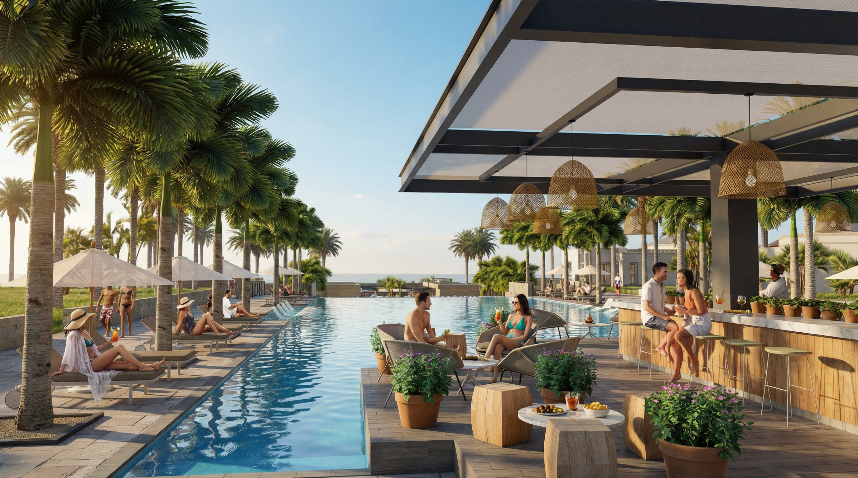 make the view more like a sunset mood emphasize the lighting in the image add lighting at the bottom of the columns bighting up the building add lighting bollard by the edge of side walk