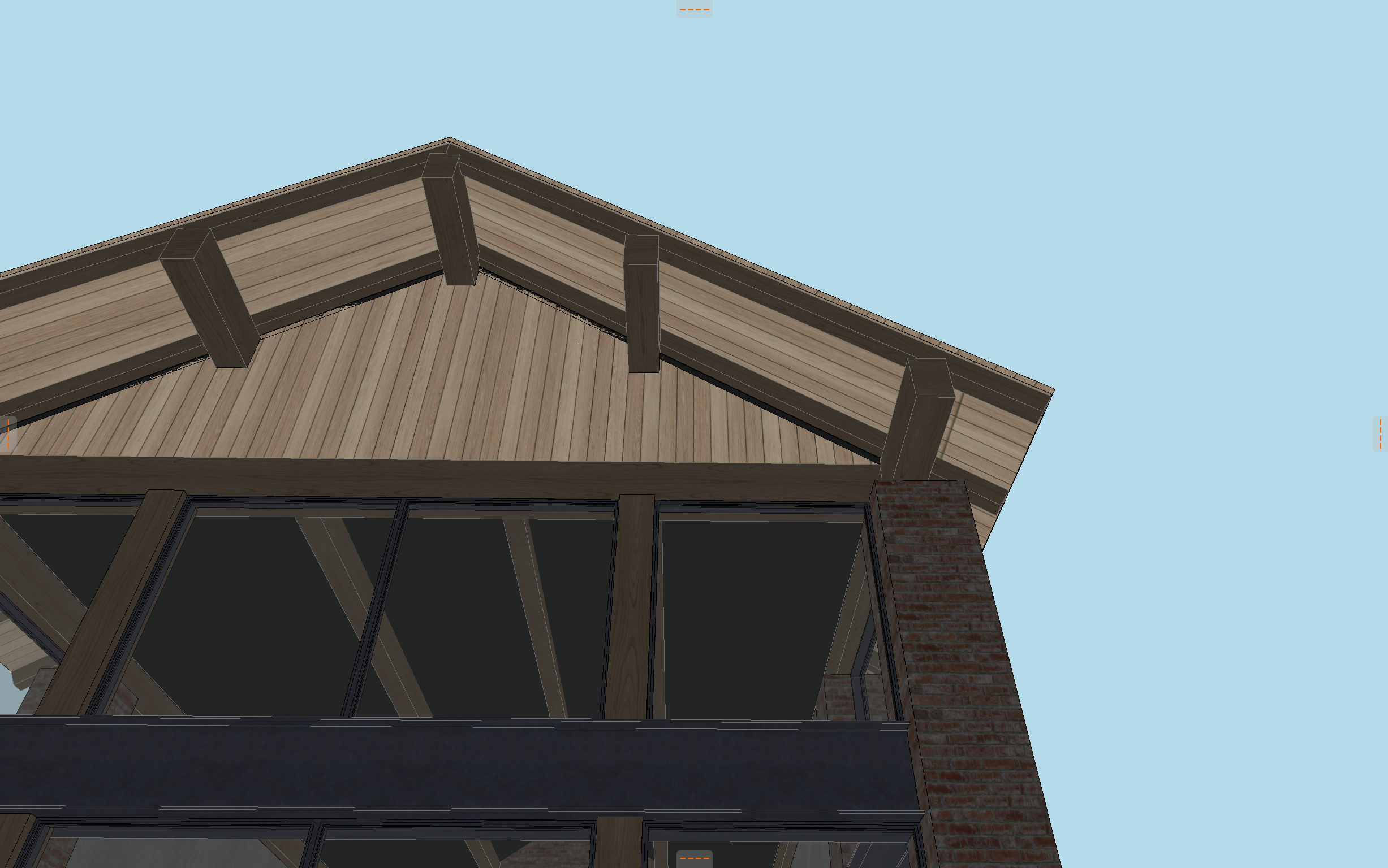 detail shot of an antique brick house with a soldier course at the top of brick walls with timber columns steel beams reclaimed pine soffit yellow pine trees in the background clouds in the sky