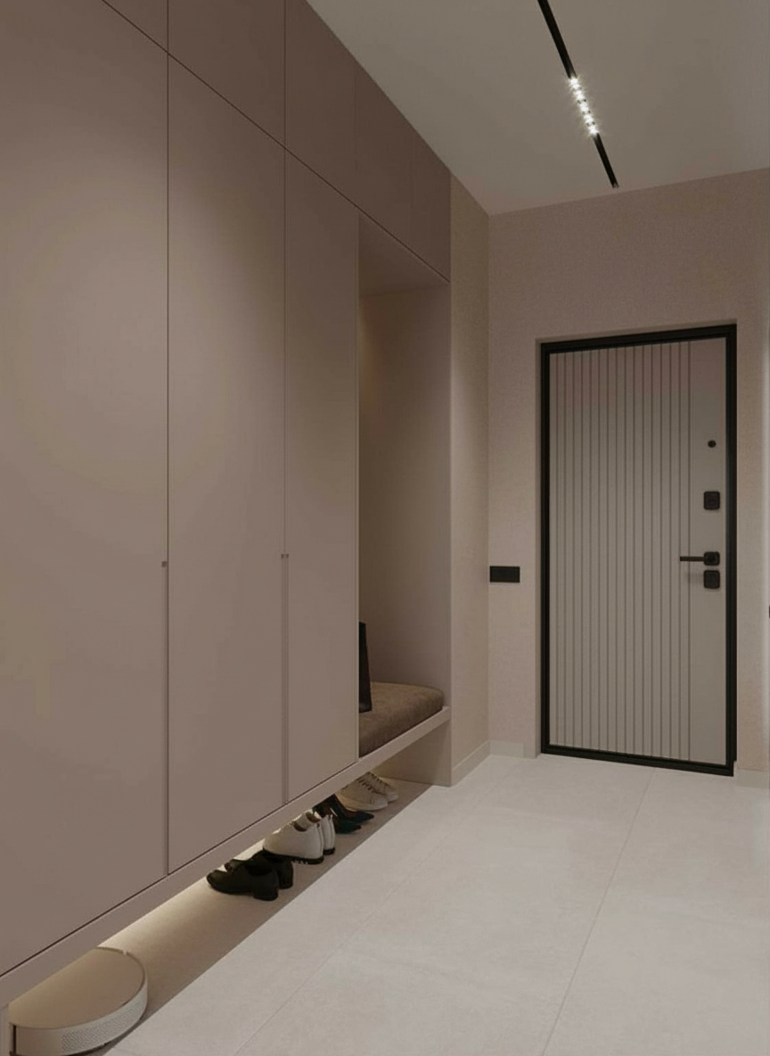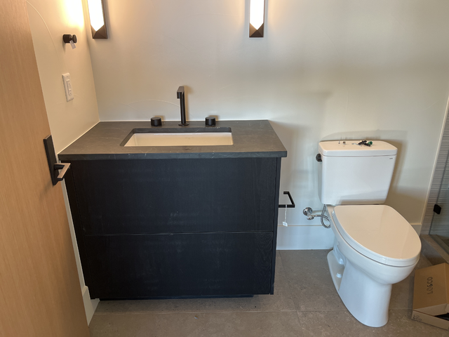 do not change the cabinets in any way preserve the exact cabinet colors materials finishes dimensions door and drawer styles hardware spacing alignment and all geometry exactly as shown do not alter the countertop shape backsplash appliances flooring lighting fixtures or wall structure only remove the construction materials clutter and mess from the scene clean the room and make it look finished and staged add a few simple tasteful home accessories appropriate for the style of the space but do not add or remove any furniture windows or architectural elements maintain the original lighting direction and realism enhance clarity and polish the photo while keeping the cabinetry and room design completely unchanged do not alter the lighting to keep the cabinet colors as they are in the image add cabinet pulls add a mirror above the sink toilet paper on the rod and artwork above the toilet