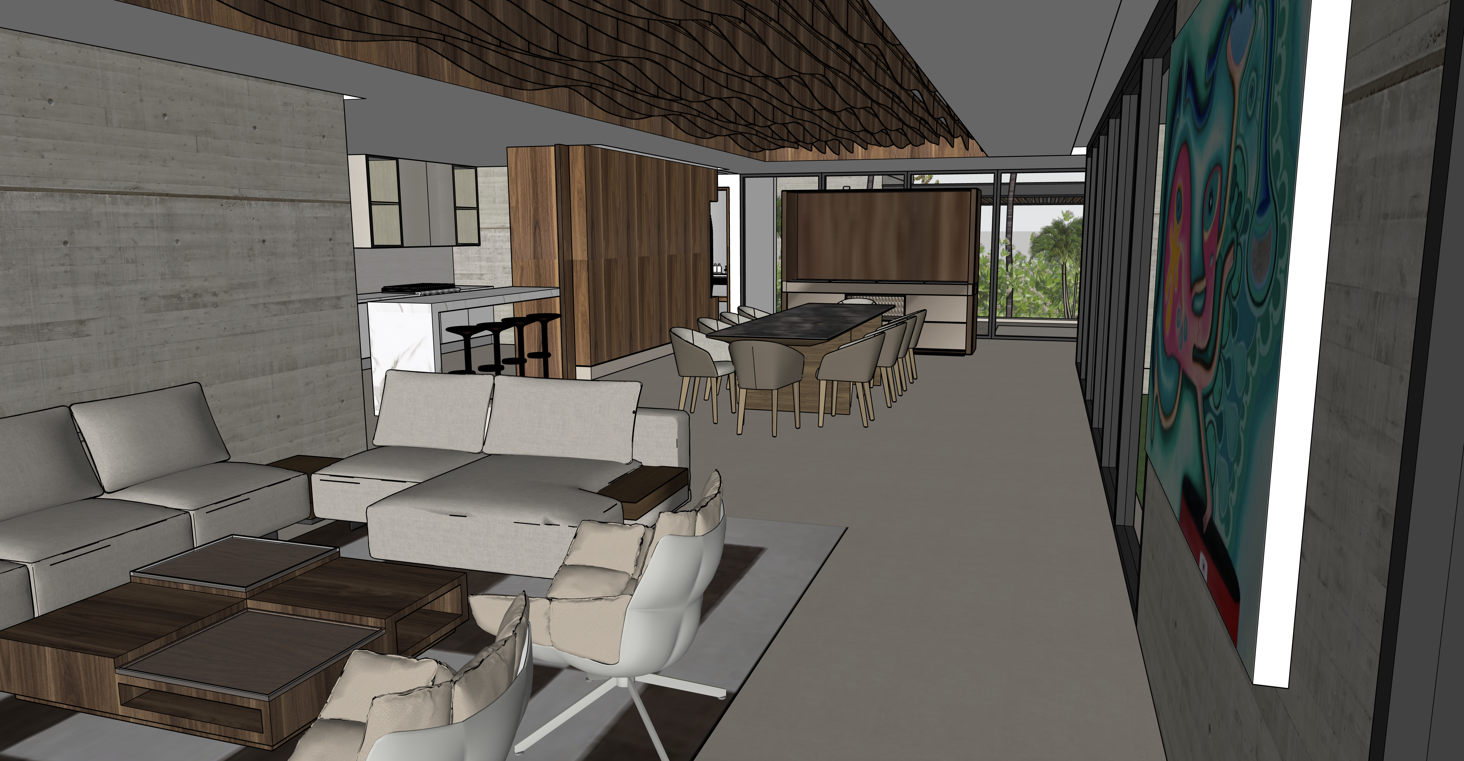 minimalistic contemporary residential design beige color large format floor andreu world chairs large marble table facing a large scale wooden console lazy concrete wall wooden baffled ceiling with indirect lighting taupe color soft furniture kitchen at the left side of the photo with indirect lighting over the stove and glass cabinets
