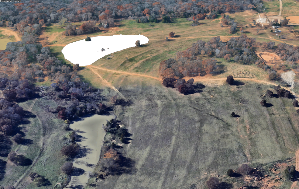 create a pretty pond where the white area is with a dock and fountain and blue clear water