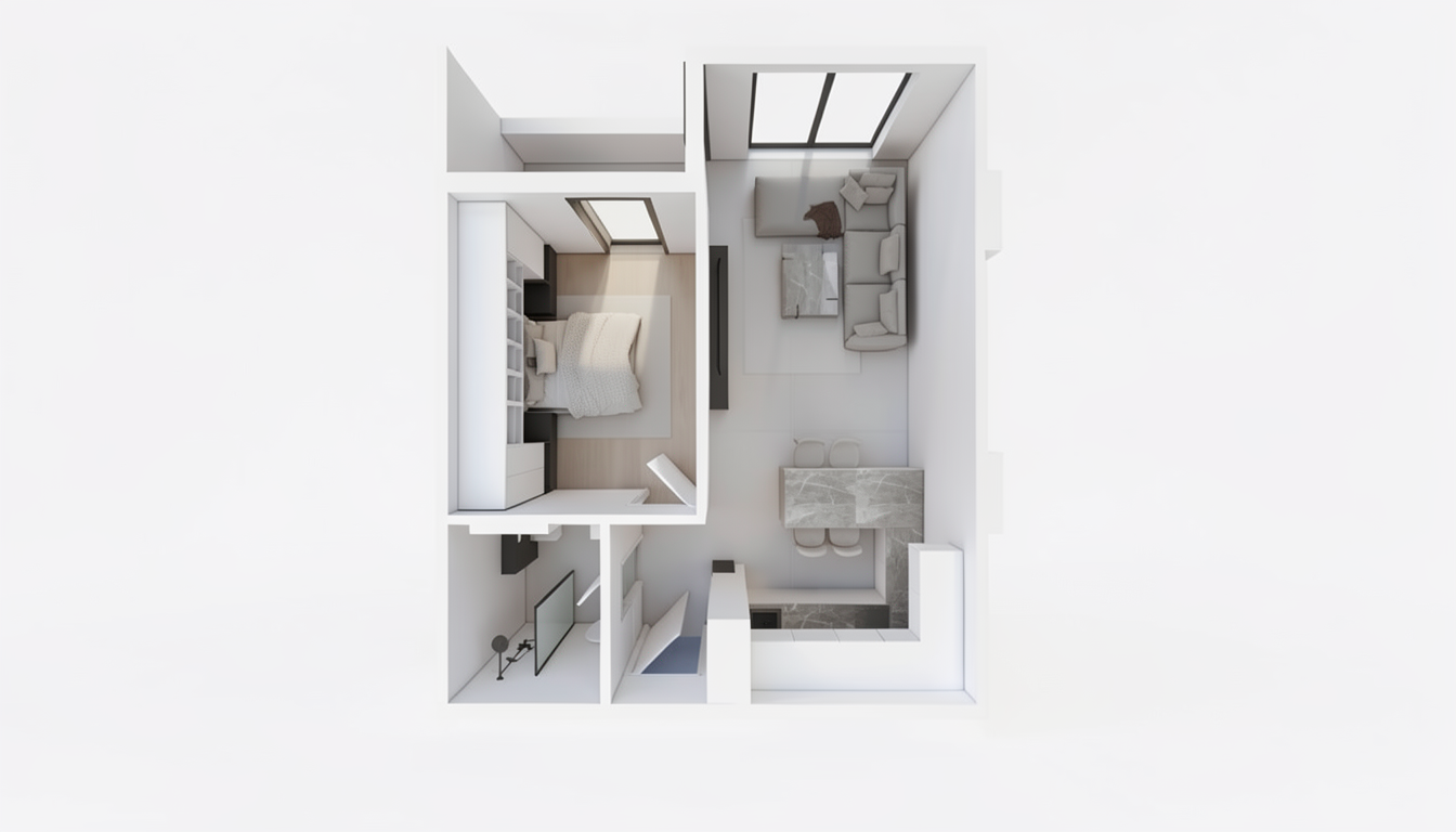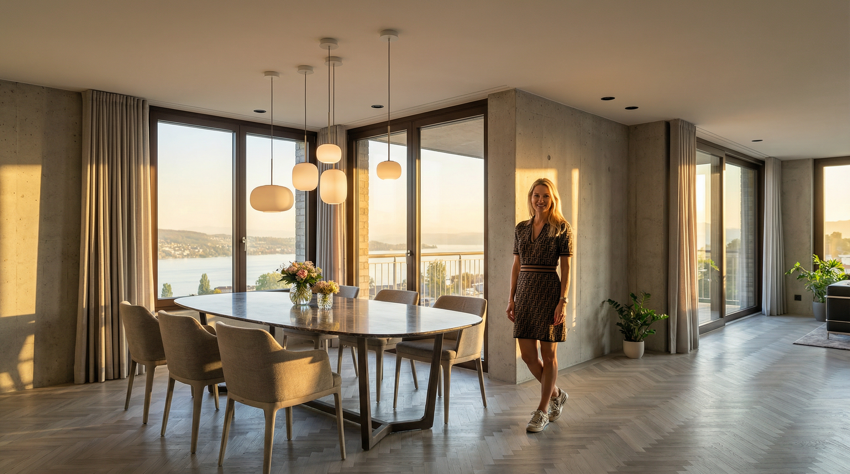 do not change the structure or model keep original texture a modern minimalist interior featuring a sleek warm white cabinet with clean lines add warm tone undercabinet light background view is from 7th floor looking over lake no island