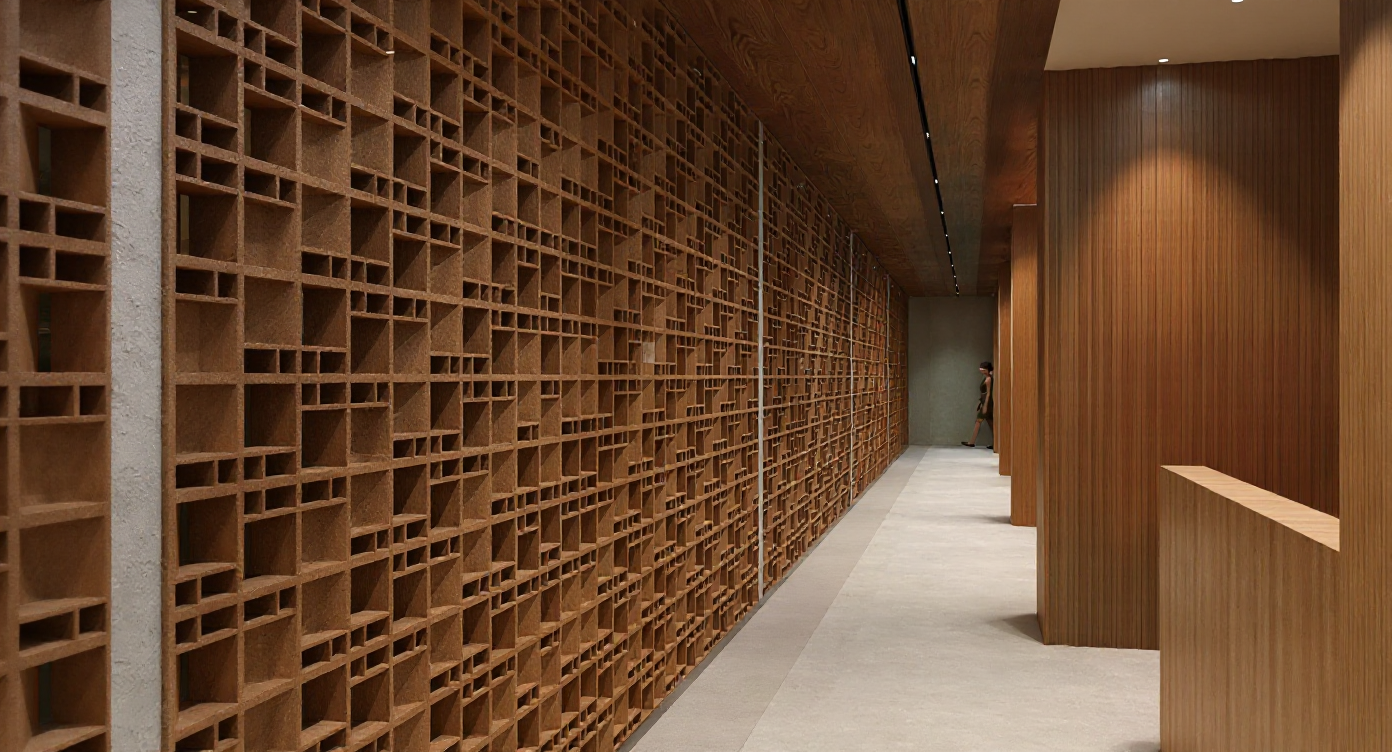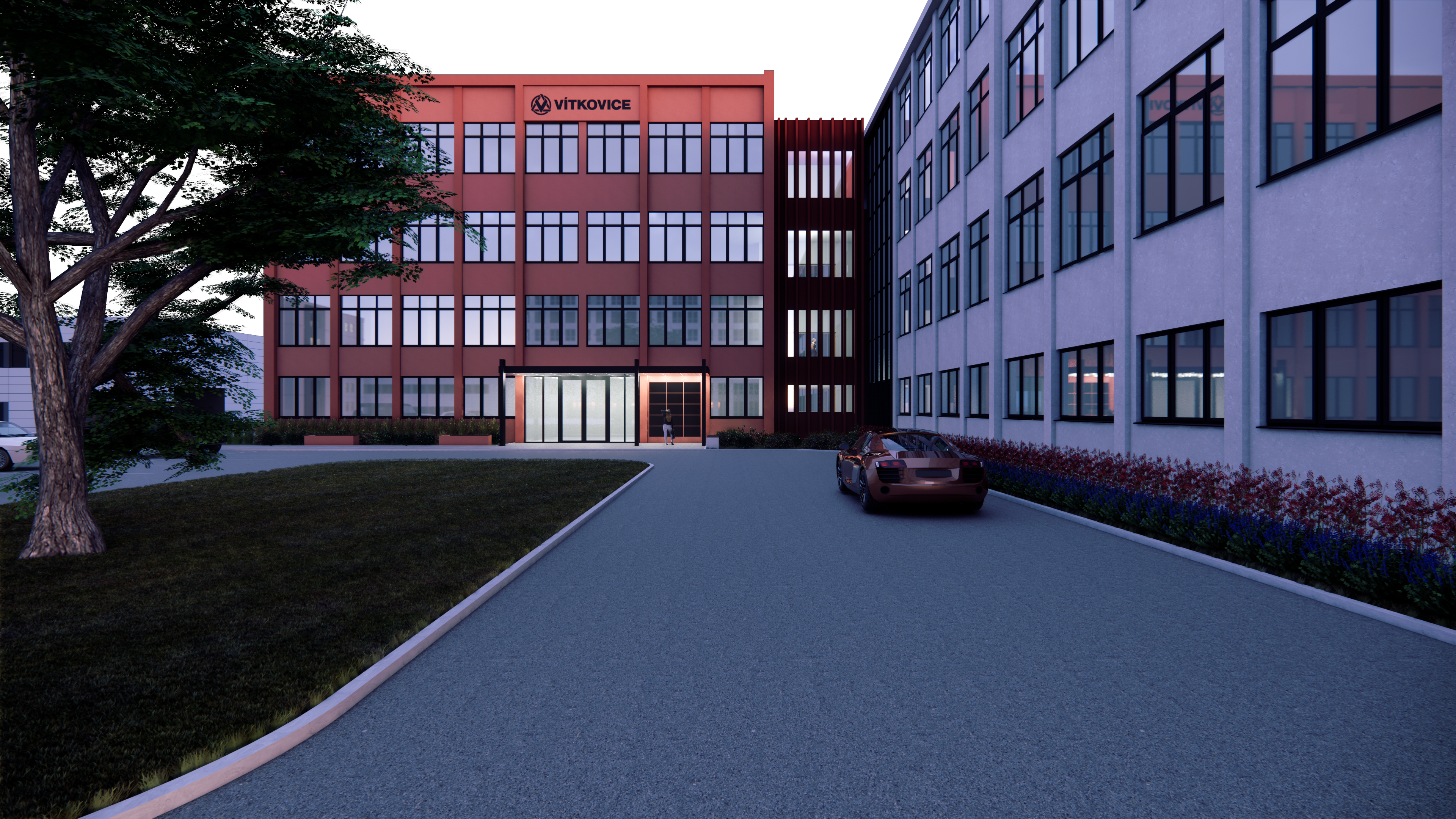 stunning evening render the red building is made of red plaster the grey of concrete realistic greenery on the grass fields turn on the cars lights keep the camera and perspective exactly the same