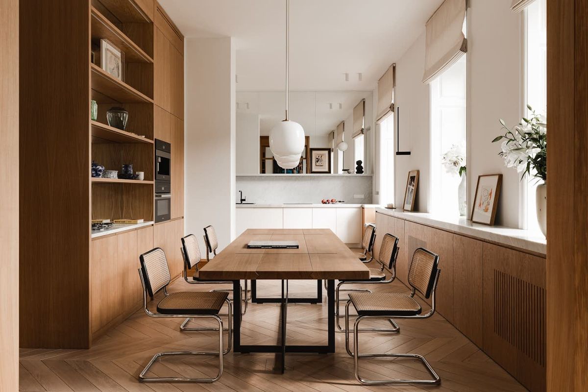 modernist exterior shot change cabinet on the right to full height kitchen cabinet remove window add window at the back center while keeping the low cabinet architecture