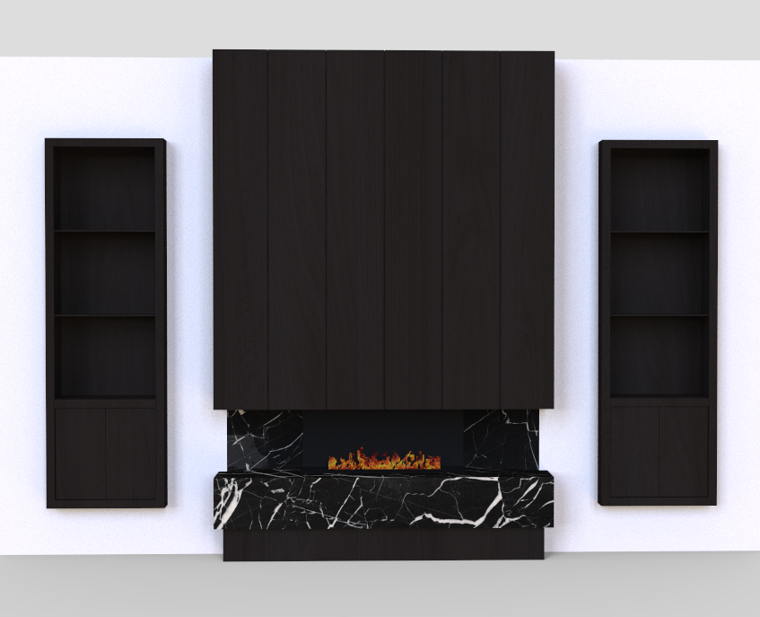 make this look photo realistic the black wood is a black stained oak with a brushed finish please add some minimal sculptural vases to the black alcoves and then dimly backlight these alcoves the floor needs to be a pale white stone tile make image more moody like it has been taken in the evening but keep wall offwhite
