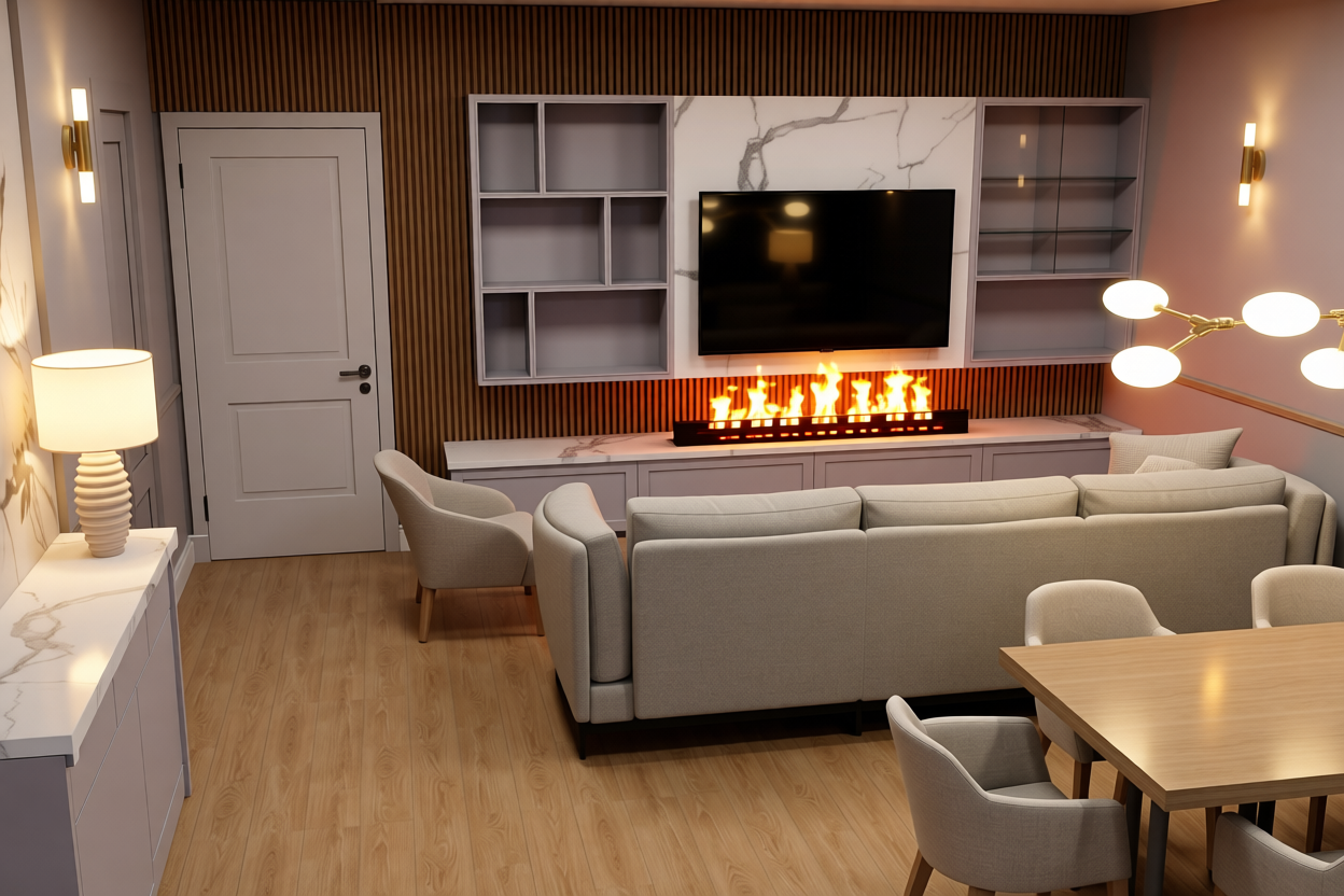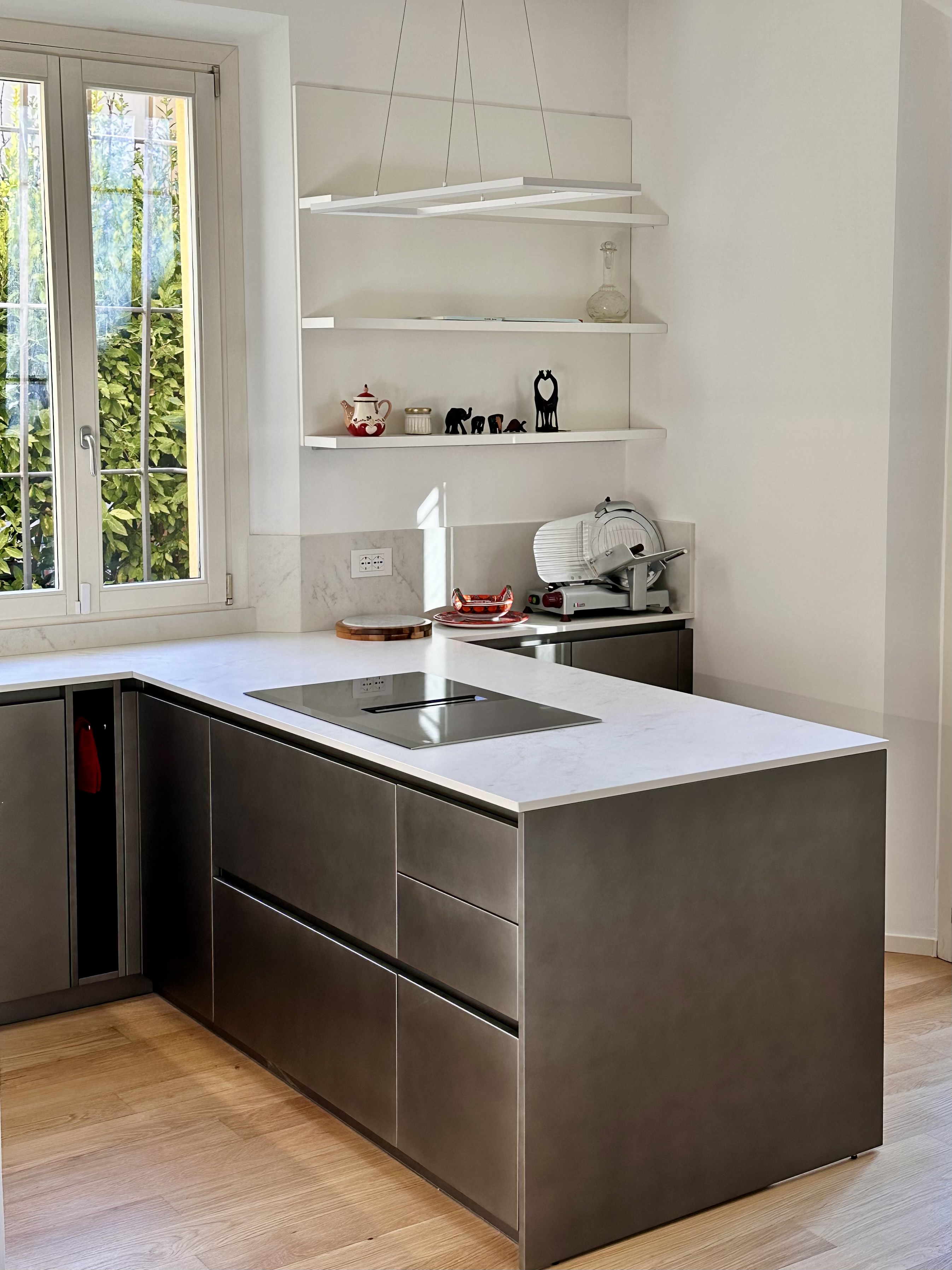 aggiungi oggettistica design sulle mensole a parete e due padelle sul piano cottura