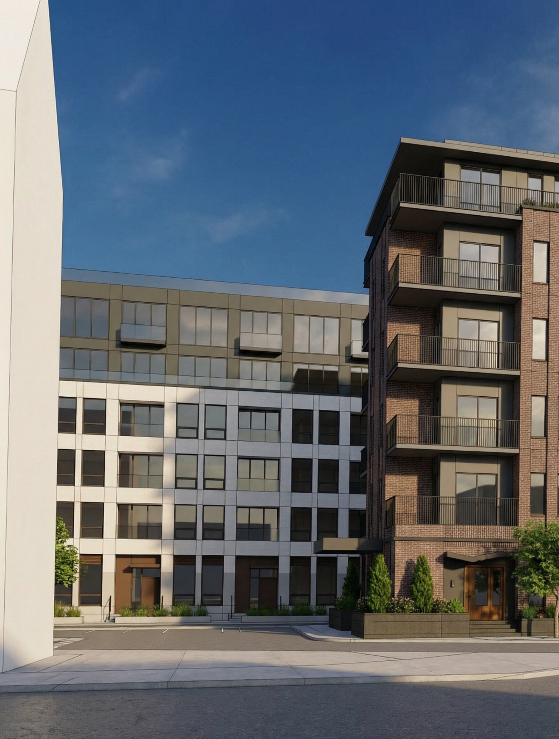 modernist exterior shot plot of 5x22 meters modern house with 2 floors bedrooms on top and open format on tge ground floor to garden and swimming pool also we need space for 2 cars on the front white shapes and sticking out volumes architecture