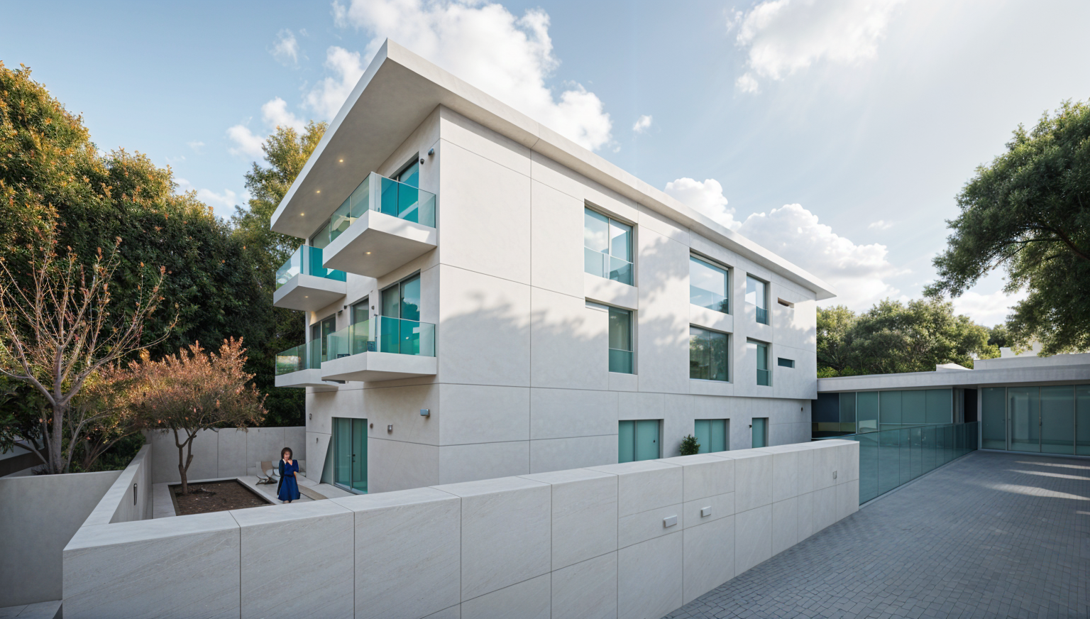 expessionism perspective shot render a building with a simple facade that has some colored accents and detailing architecture