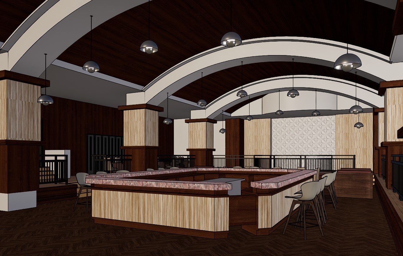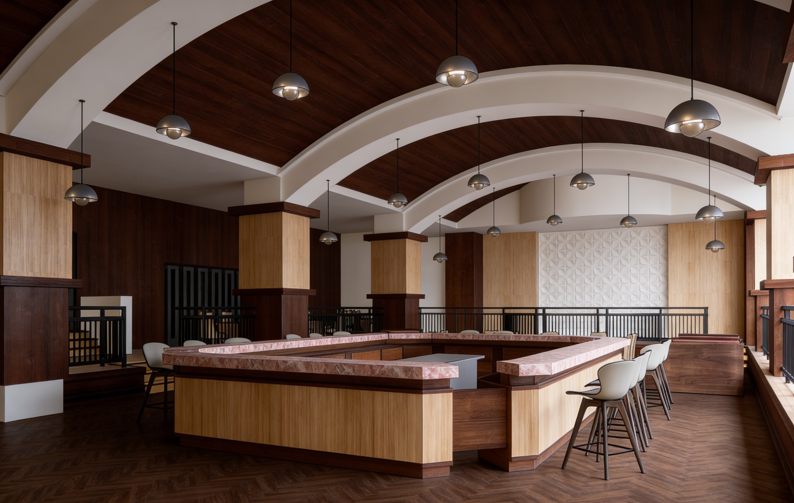 create a beautifully rendered interior scene of a modern bar with a warm and inviting atmosphere the ceiling features elegant dark wooden arches contrasted by soft cream colored beams pendant lights hang gracefully casting a gentle ambient glow the pillars are adorned with a light natural wood texture while dark wooden accents add depth and sophistication the bar counter showcases a polished rich wooden base with a sleek marble top in subtle shades of pink and white arrange bar stools with a smooth light gray finish around the counter the walls feature a combination of dark wood and a decorative panel with geometric patterns in light cream the floor is covered with a luxurious dark brown herringbone wooden pattern enhancing the room s warmth and elegance