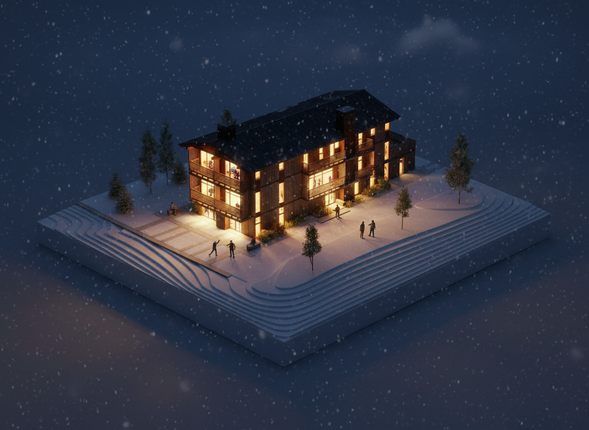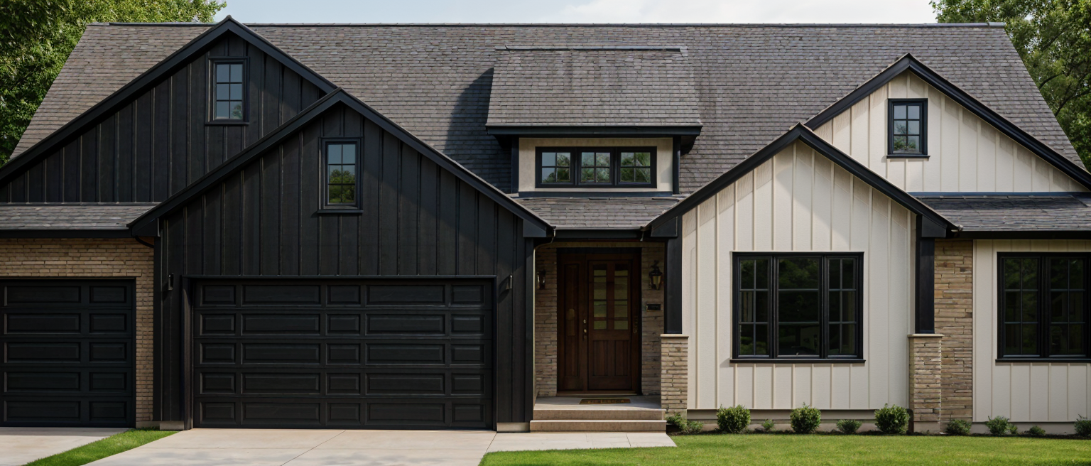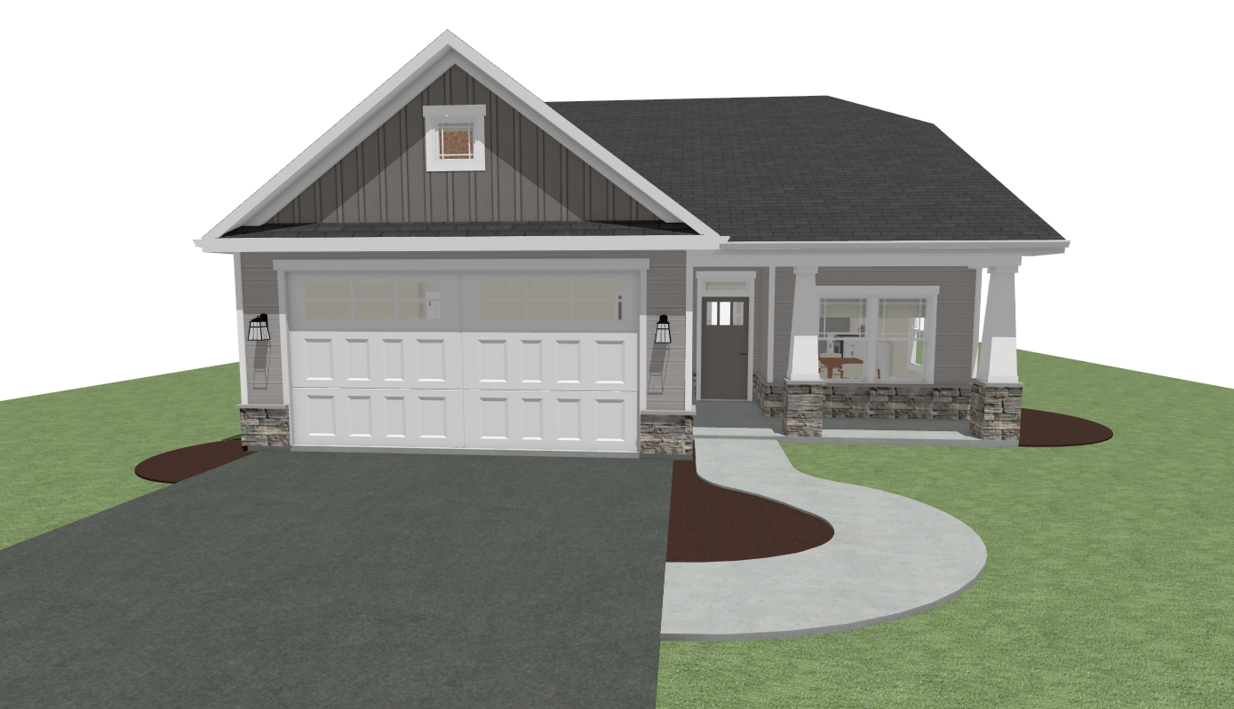 render this 3d image to appear photo realistic maintain all existing architectural materials and structural elements exactly as shown enhance the setting with a lush well maintained landscape include minimal beds manicured shrubs and a tree lined backdrop that frames the home naturally the windows should have a glossy finish with clear reflections of the surrounding trees and sky lighting should feel natural with soft shadows and realistic depth to bring the scene to life