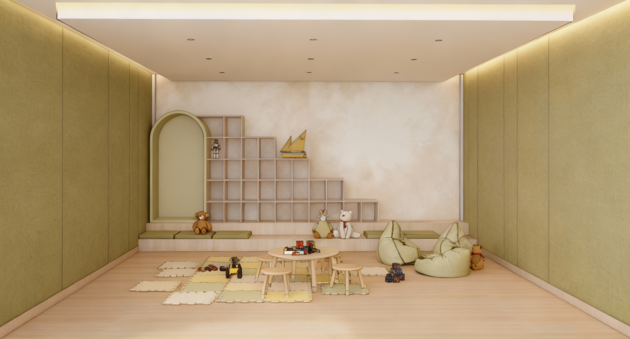 modern children s playroom interior render with a warm and calming atmosphere neutral color palette with soft olive green textile wallpaper on the side walls and light beige limewash texture on the background wall padded play mat flooring with light neutral colors beige pale yellow pale olive green and integrated stepped shelving against the back wall for toys and books rounded soft olive green arch niche plush stuffed animals round wooden play table and stools and cozy soft olive green beanbag seating light wooden flooring soft indirect ceiling lighting safe and minimal design clean lines and photorealistic textures with a gentle comfortable mood