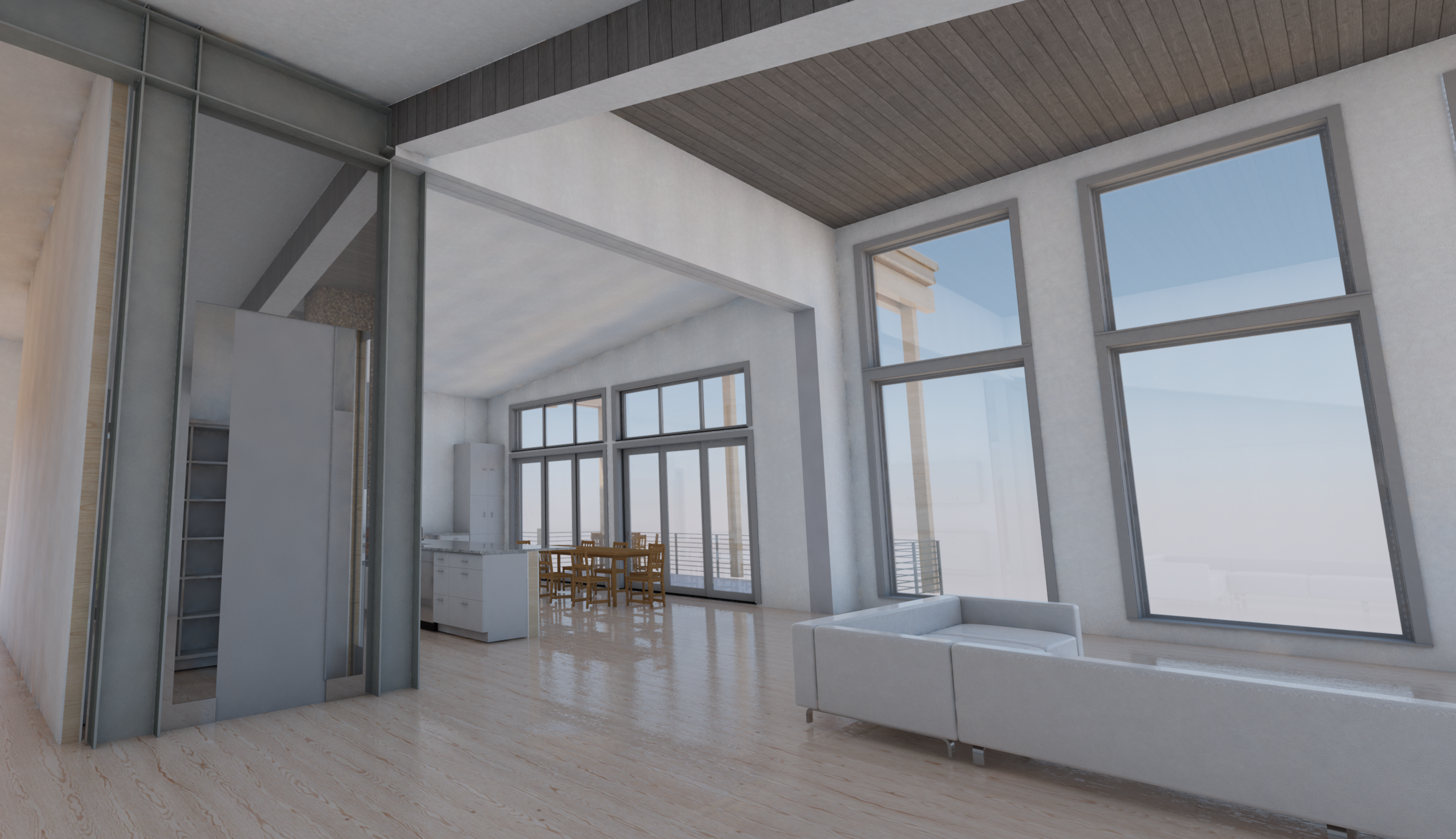 ski house party with snowy mountains and pine forest out the windows glass wine cellar between the steel posts in the foreground on the left with dining room beyond with table set for a party at sunset dark flooring