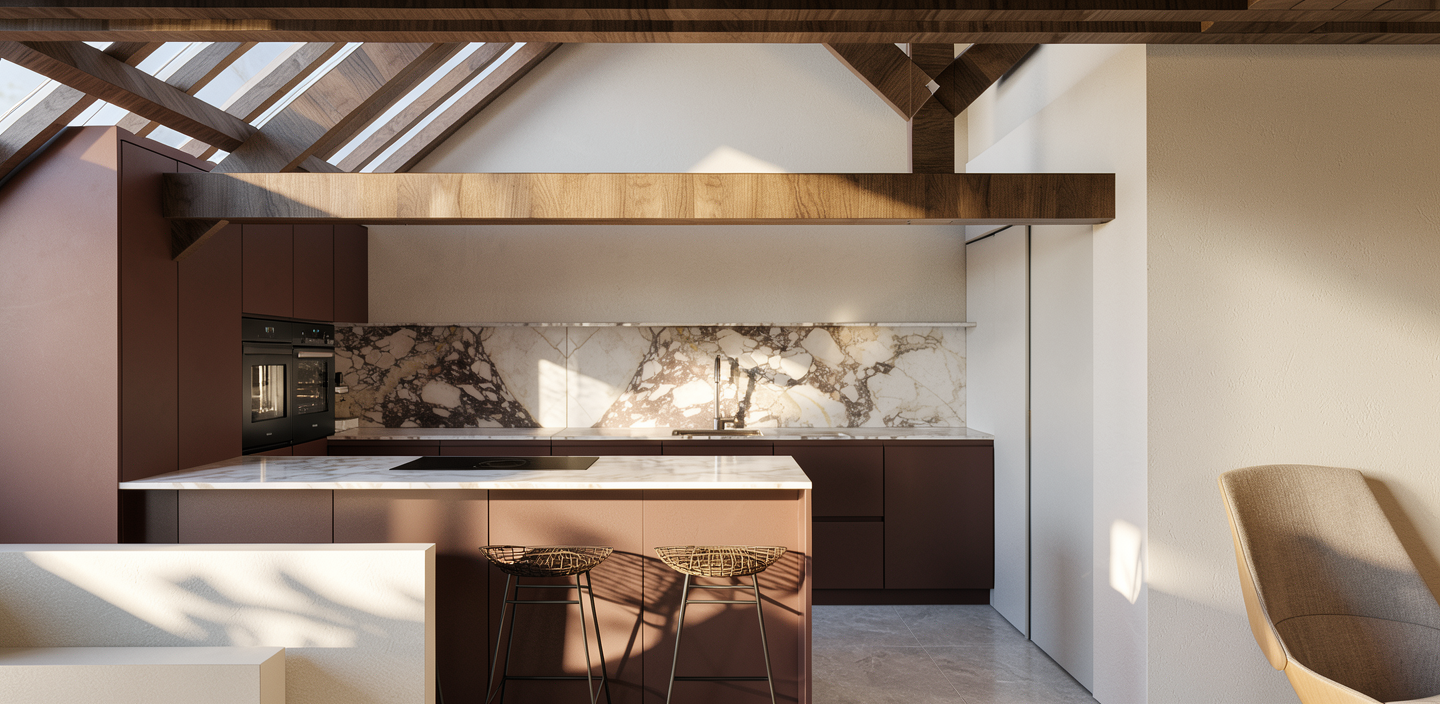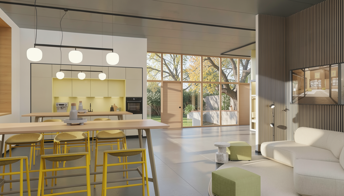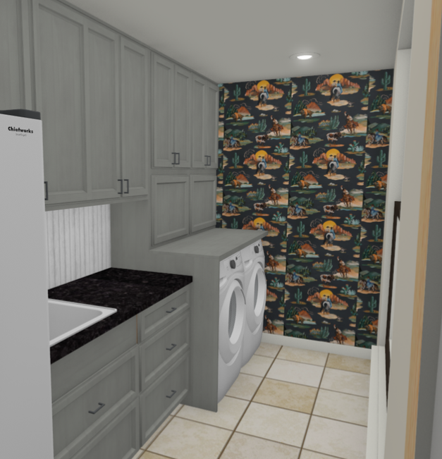a laundry room with soft painted gray cabinets and matte black handles the walls are adorned with a vibrant desert themed wallpaper with hues of deep orange greens and earthy browns creating a warm inviting atmosphere a sleek silver washer and dryer set while the countertops feature black solid with no veining the ceramic floor tiles are a subtle beige providing a neutral base soft overhead lighting creates a gentle inviting glow the overall ambiance is stylish homely and vibrant