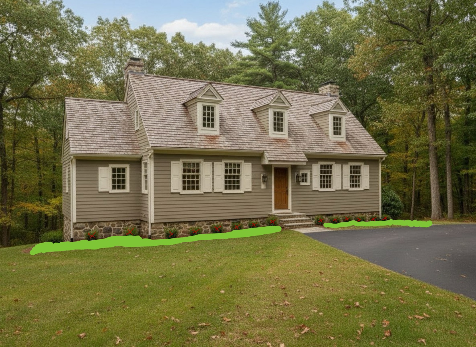 everything in this picture needs to stay the same except the solid green turns into lawn and the bushes that have a red x need to be deleted