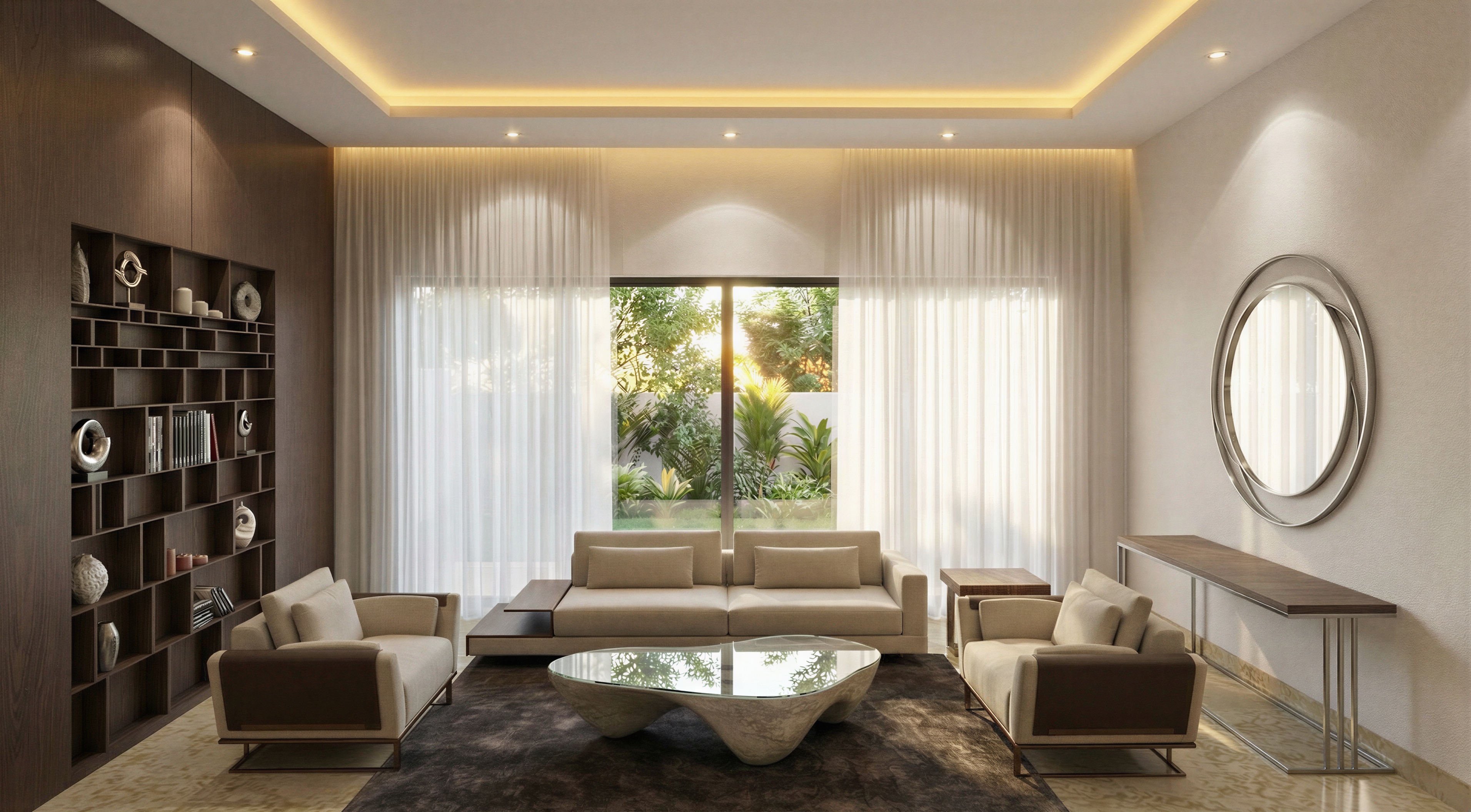 keep view as is just enhance interior ambience to be brighter then add a warm tape light under the shelves add cool decorative objects on the coffee table and right console replace the right console with a more contemporary organic style in a walnut wood material