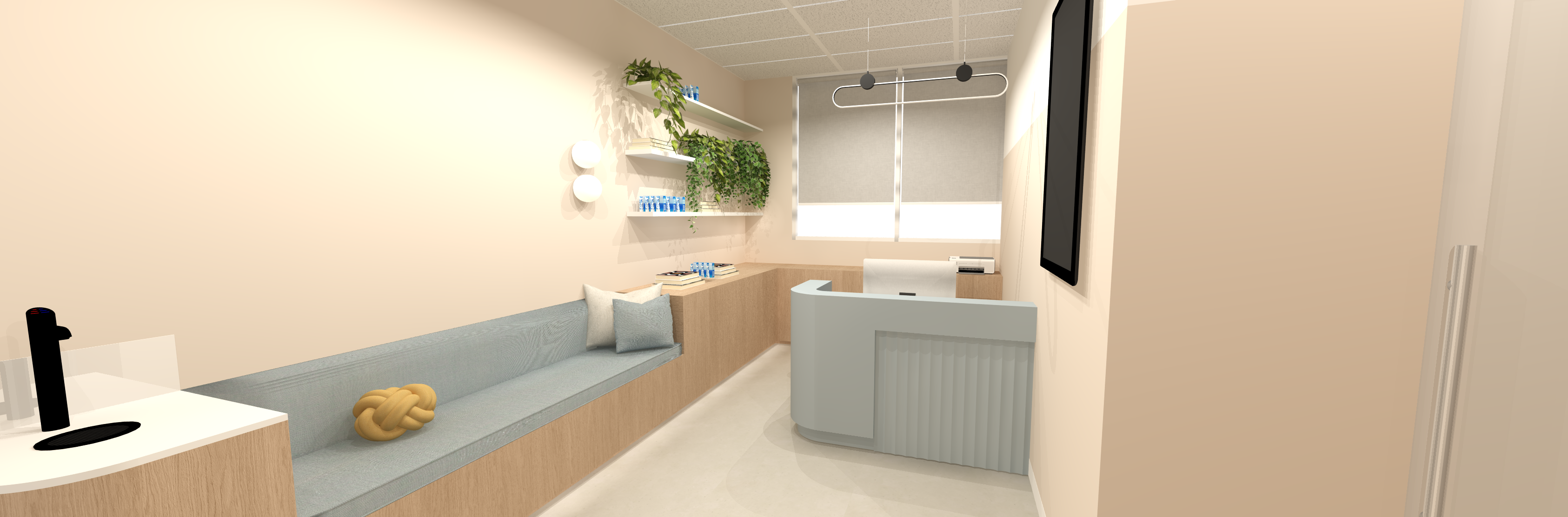allow for soft warm natural light to enter the space through the glazing small section of blue sky in the glazing more deeper soft blue to counter and upholstery