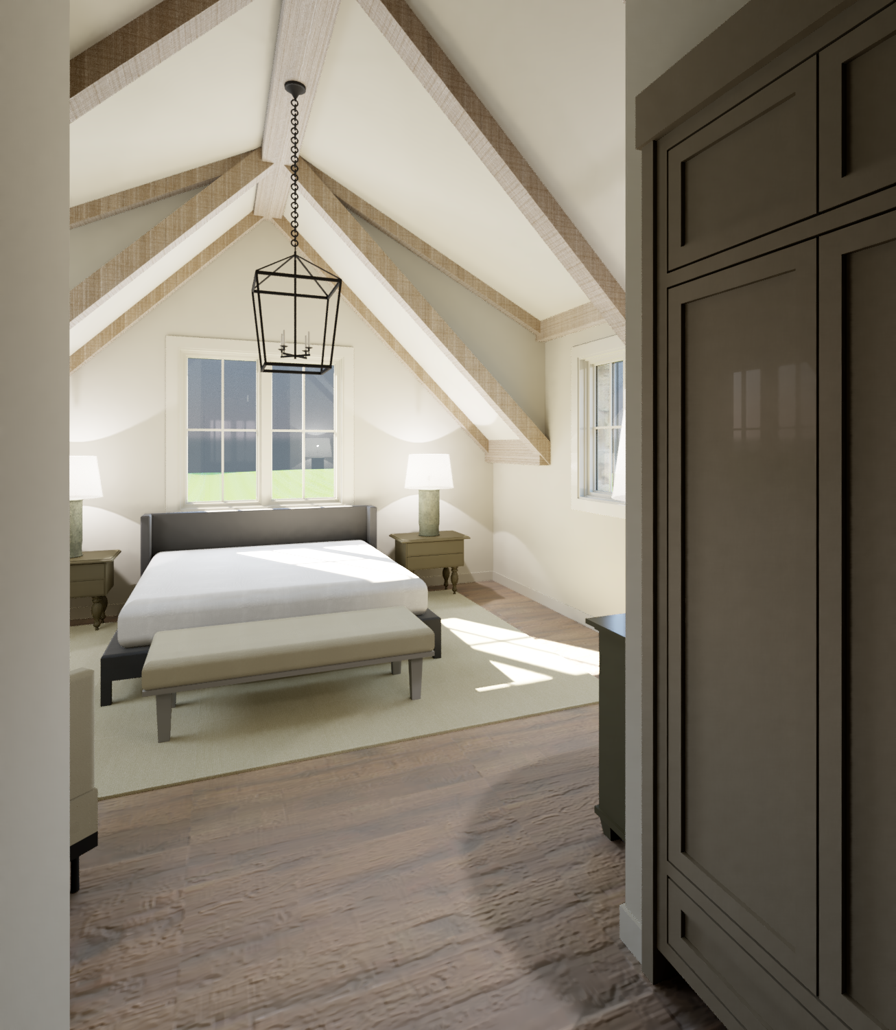 large pillows big folded duvet at foot of bed beefier metal framing on pendant light large lampshades on lamps on nightstand more modern bench at foot of bed rustic sisal rug on floor windows look out at midwest north woods no mountains