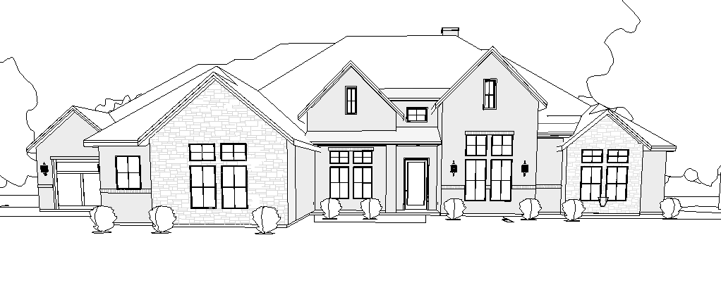 exterior rendering of traditional home with red tone brick creamy limestone black windows black roof