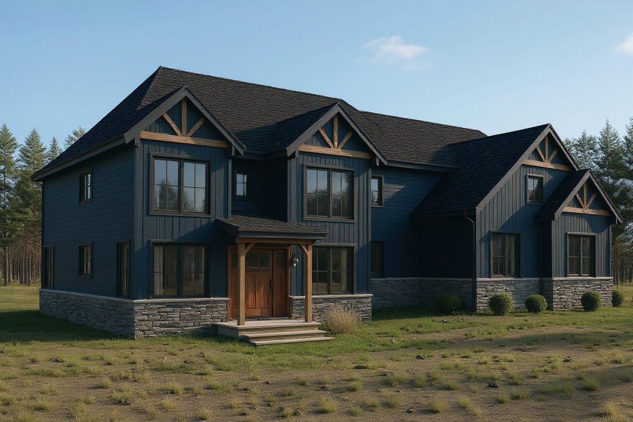 dark blue siding black trim around all windows add in black mulch beds that hug the house with very minimmal shrubs metal roof only above the front entrance