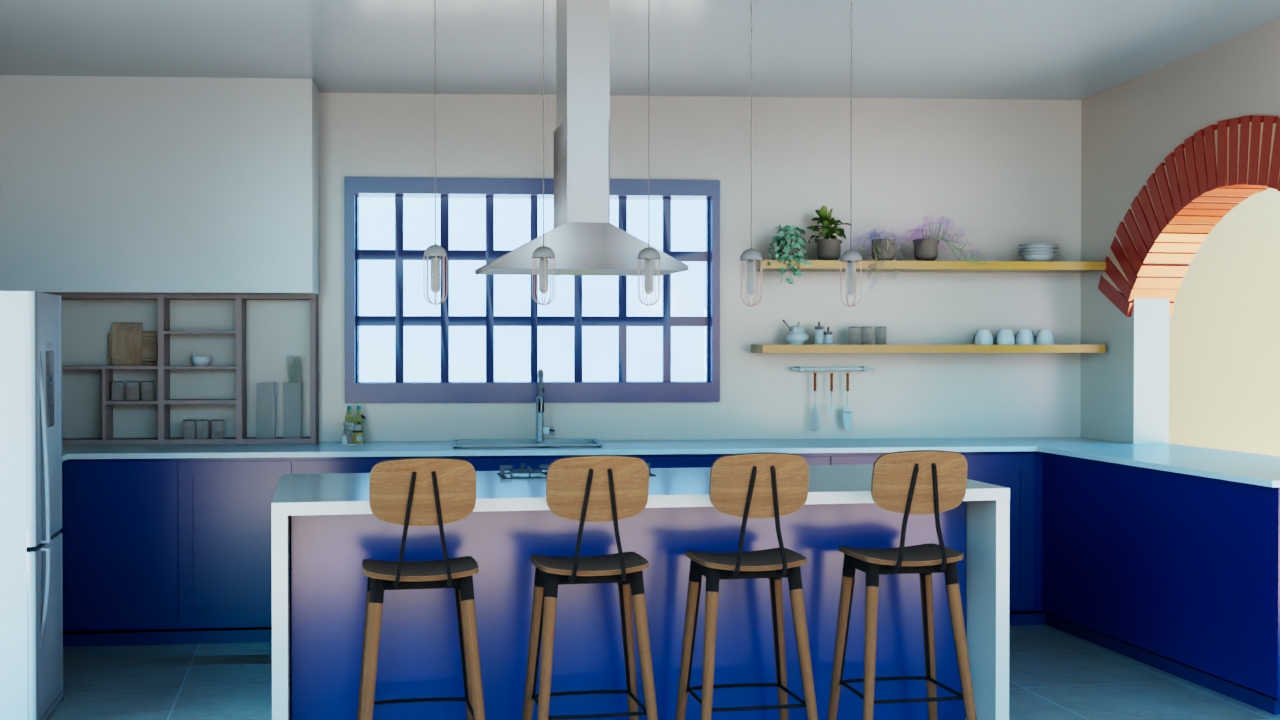 minimalism interior shot interior shot of a traditional kitchen with dark blue pantries and white countertops dark wood shelves blue island with beige countertop golden hour blue window frame trees view from window steel chairs on the right side brick arch frame architecture