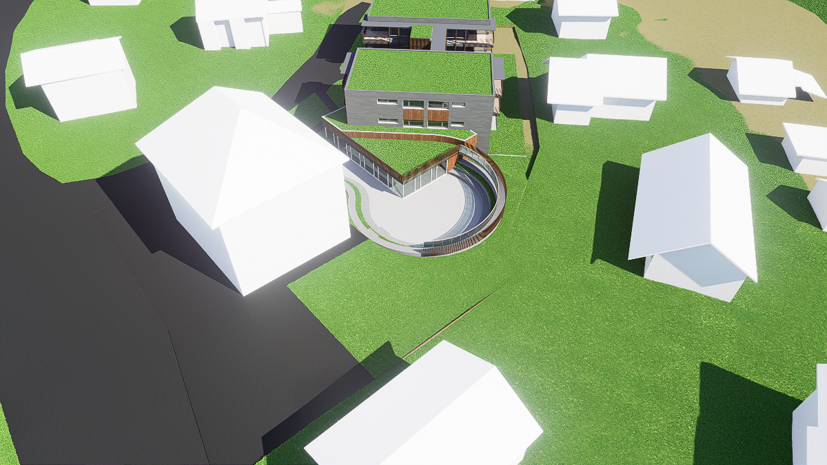 appartment building in a swiss village with trees and greenery gry horizontal cladding ve getation on roof