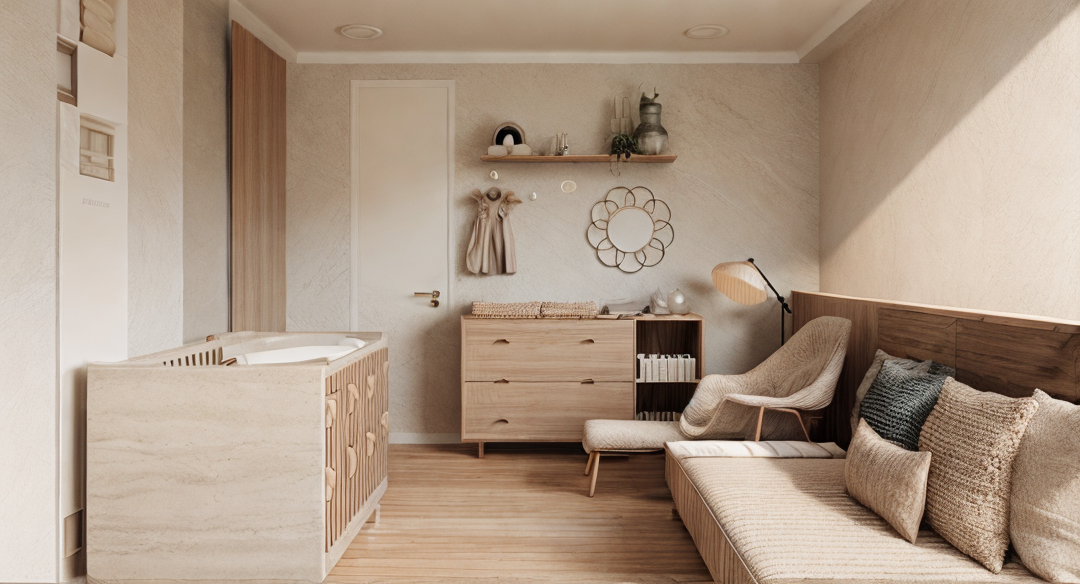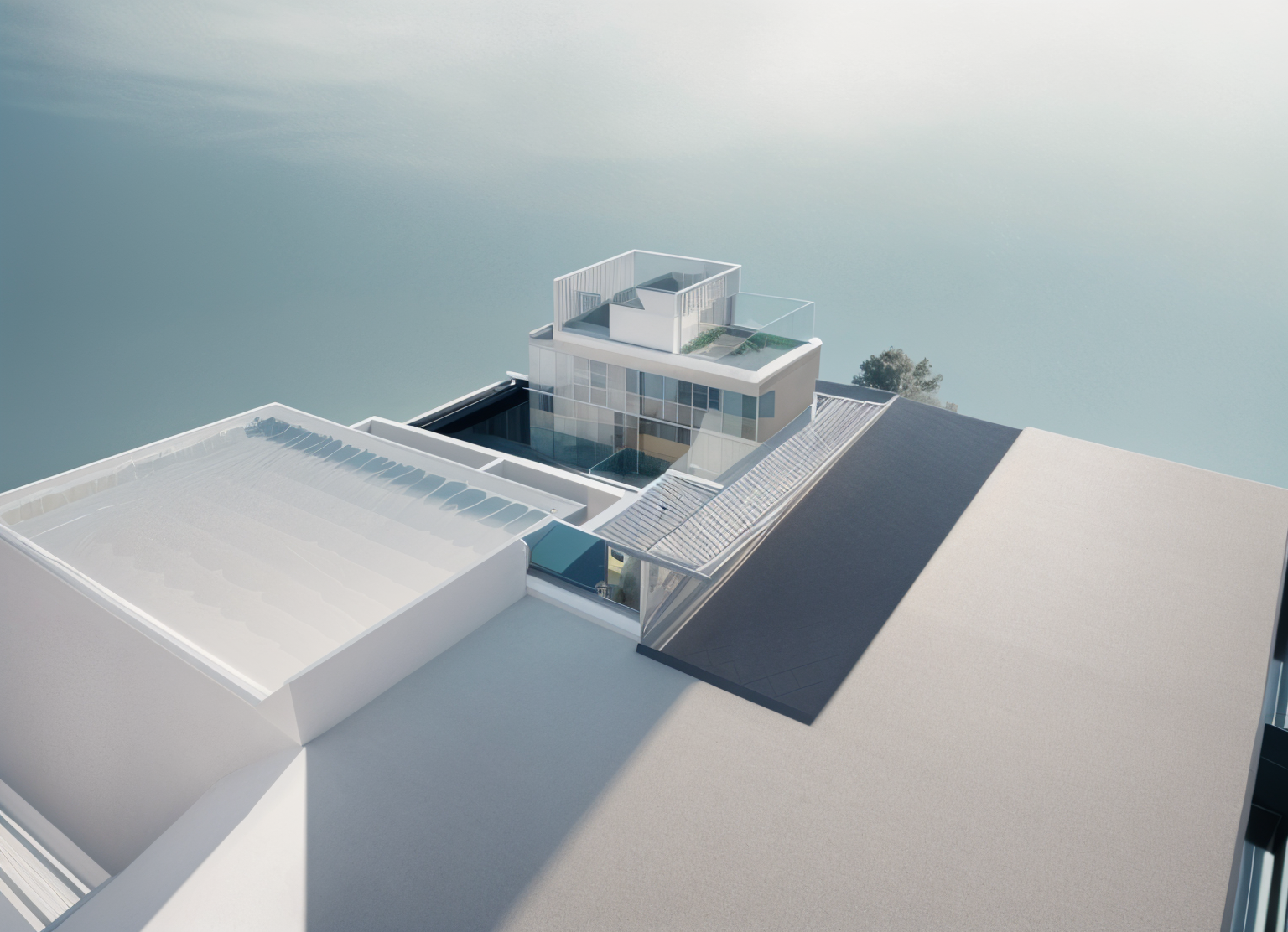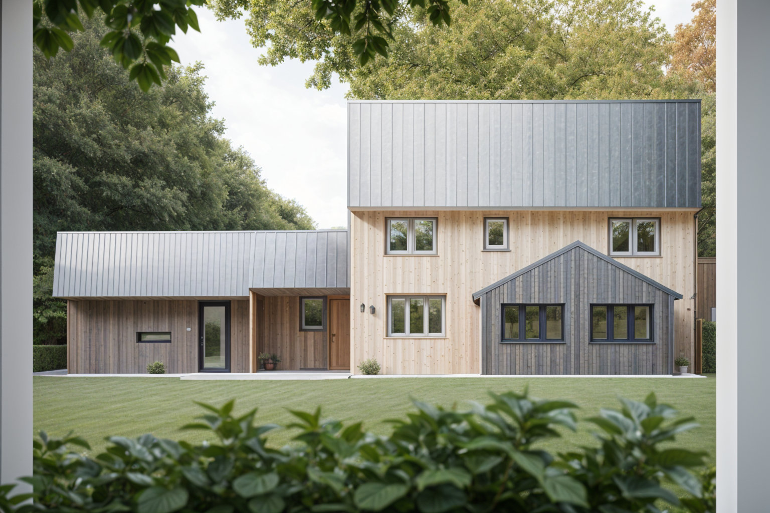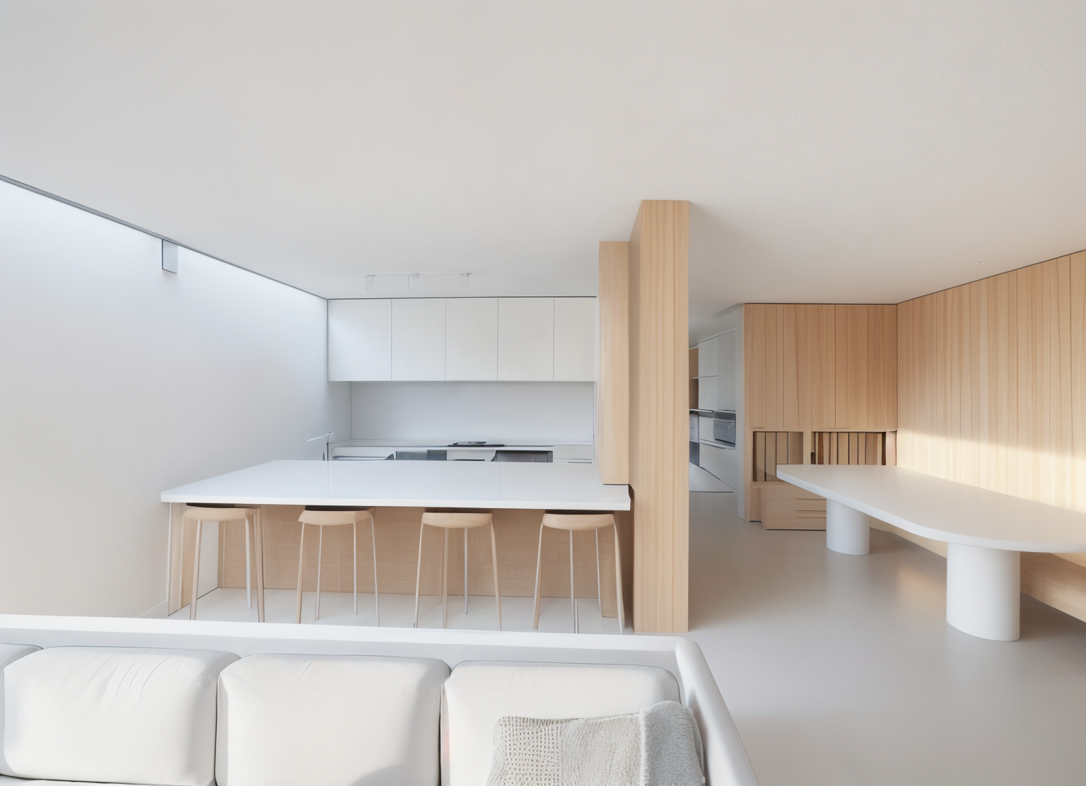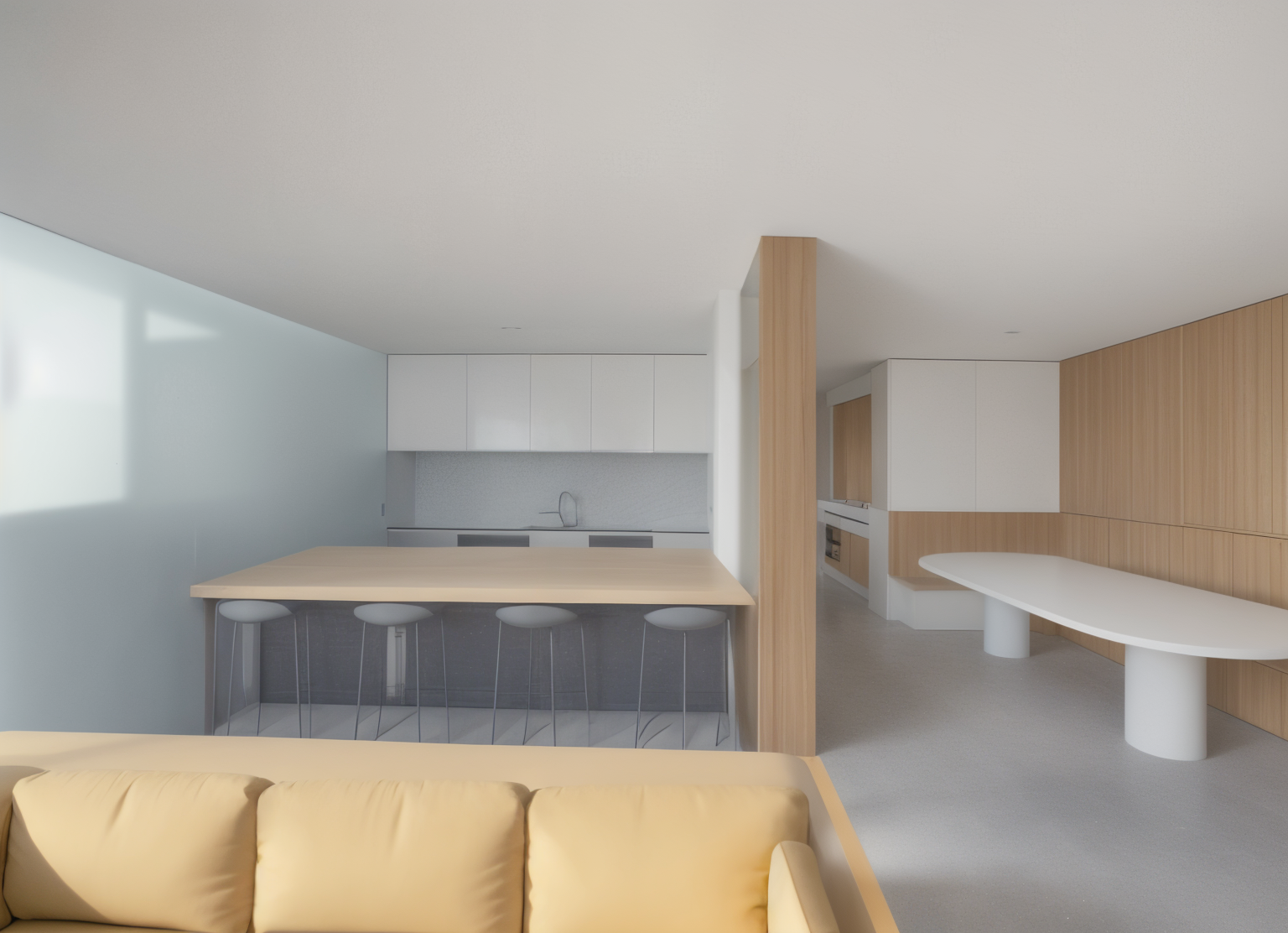 modern perspective shot add a sofa against the right hand wall to allow seating at the dining table replace the wooden paneling on the right with a plain white wall on the left in the kitchen area make sure to include a refrigerator architecture