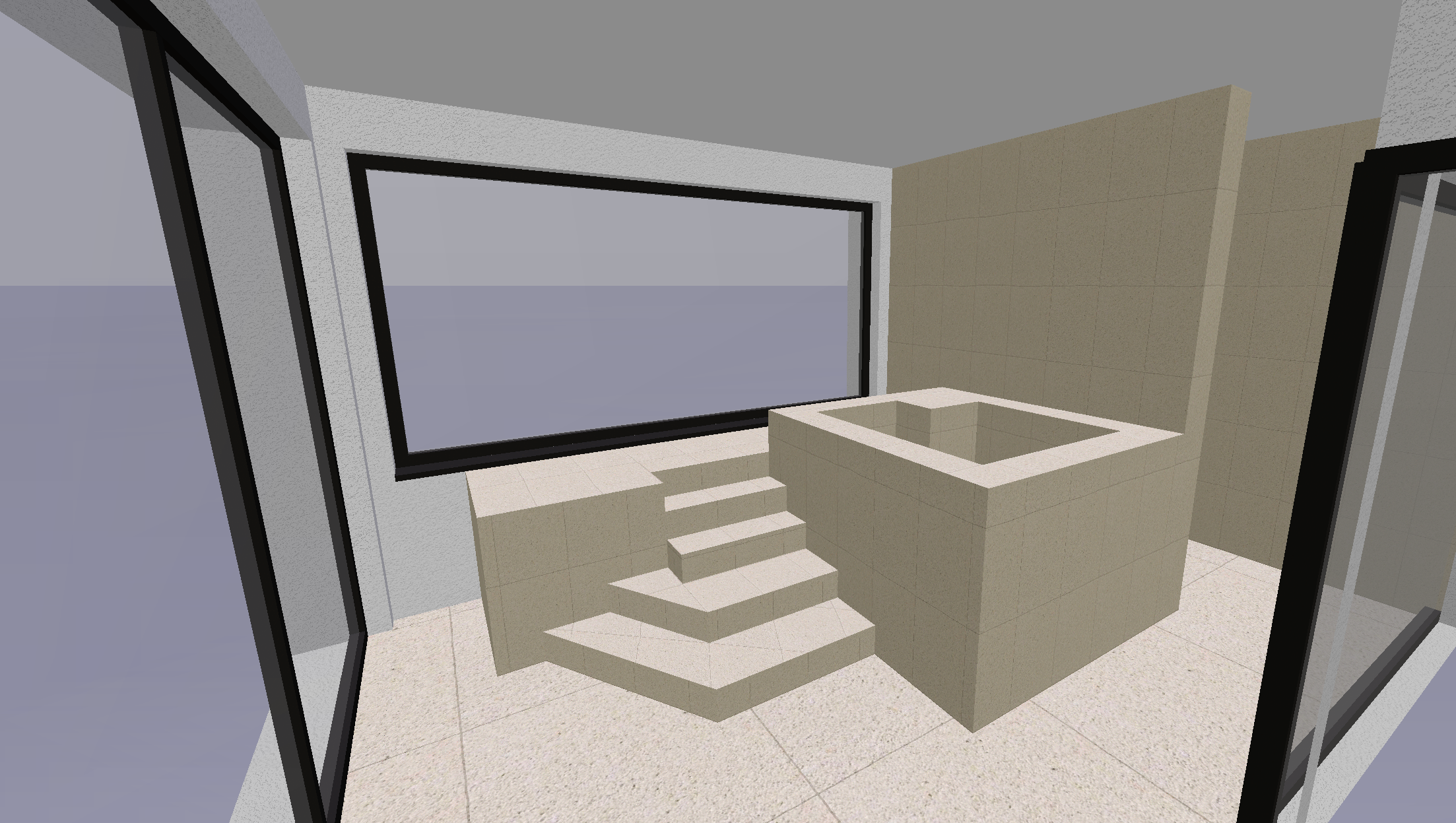 genau dieses rendering berarbeiten fotorealistisches innenraum foto exakt dieselbe perspektive und kameraposition wie das hochgeladene referenzbild 100 identische raumgeometrie rechts hinten ist die dusche auf der linken seite einen treppe bers eck mit indirekter beleuchtung der untersten beiden tritte vollfl chige horizontale jalousien ausserhalb der fenster alles beigen w nde und der beige boden ist homogener hellbeiger kalkstein visso montenegro platten 80x40 cm alle anderen w nde und die decke sind weissputz ral 9016 das fenster in front hat auf der linken seite einen transparenten beigen vorhang beim fenster auf der linken seite ebenfalls ein raumhoher vorhang rechts hinter der wanne ein modernes bild an der wand am boden steht vorne im bild auf der linken seite eine grosse moderne topfpflanze auf der linken seite hat es auf dem podest b cher und accessoires eine sehr h bsche asiatische frau um 25 sitzt im mit wasser gef llten tauchbecken raum zus tzlich k nstlich ausleuchten mit schwarzen runden deckenspots sanfte realistische schatten weiches nat rliches tageslicht mit schatten der jalousien an den w nden realistische materialien hochwertige oberfl chenreflexionen nat rliche farbwiedergabe golden hour feeling hell ausleuchten das bild muss wie eine professionelle fotografie aussehen es soll ein echtes und reales foto sein canon eos r5 35 mm festbrennweite f 2 8 hyperrealistisch dslr qualit t raw aufnahme 8k aufl sung extrem scharf perfekte tiefensch rfe professionelle architekturfotografie
