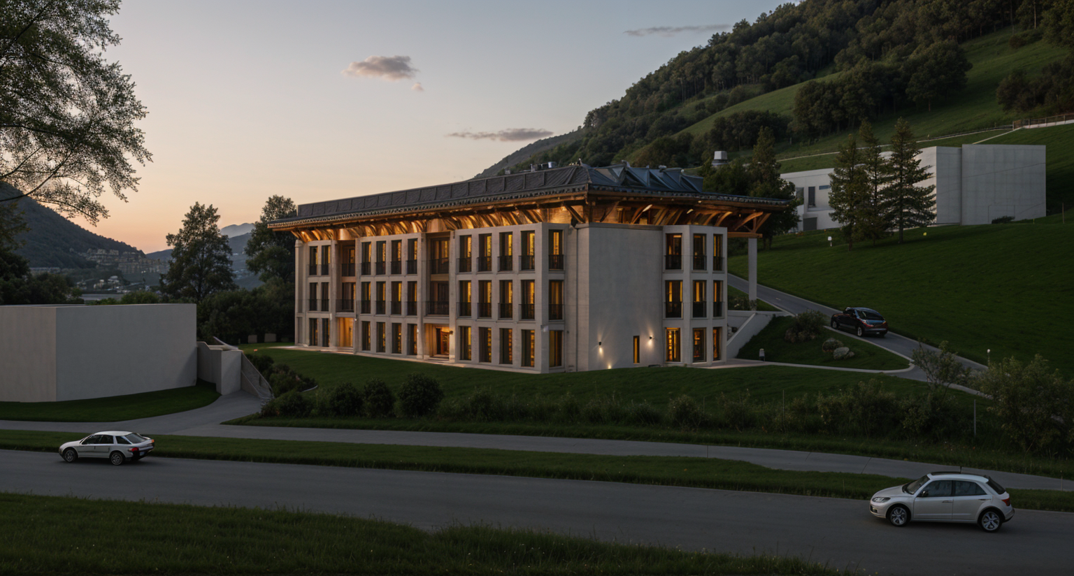 render a modern office interior with a sleek and professional atmosphere use soft warm lighting to create a welcoming ambiance the reception desk is made of dark walnut wood and should have a polished finish to highlight its elegance the walls are painted a neutral off white color providing a clean and spacious feel the floor is covered with light gray oak wood planks offering a subtle texture add transparent glass partitions with black metal frames to accentuate the modern design the mounted tv on the wall has a slim black frame the ceiling features a grid pattern in a soft gray tone blending seamlessly with the overall aesthetic