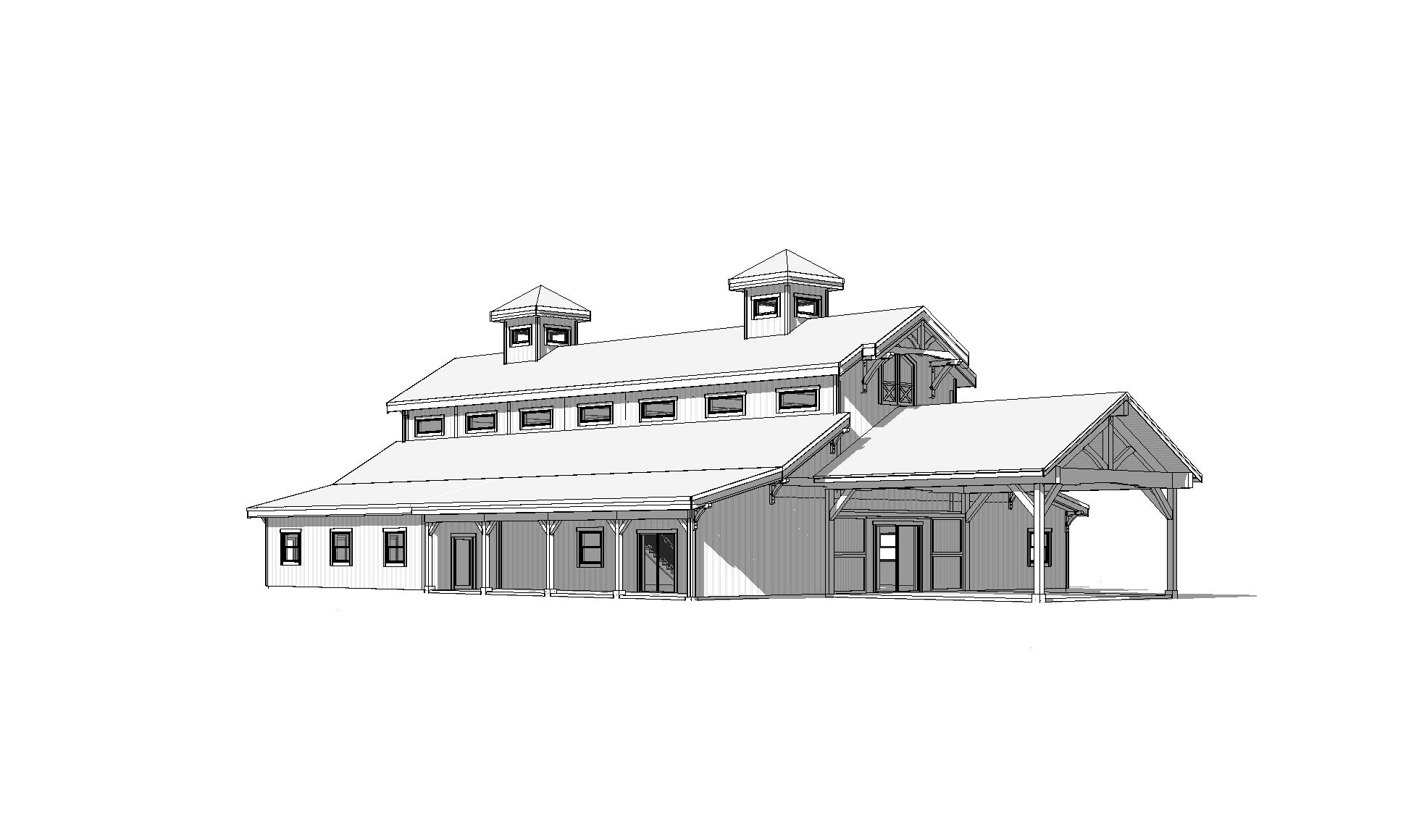 clean rustic event venue architectural exterior home rendered in cinematic daylight lighting with bits of blue skies and sunlight coming through the clouds event venue in a lush beautiful montana setting with green grass hills and a mountain range in the far distance in the background warm glow and reflections off of the windows select grade vertical wood siding green manicured landscape around structure with gardens and patches of grass black standing seam metal roof high fidelity photorealistic visualization crisp shadow falloff refined facade geometry soft atmospheric depth premium architectural photography mood ultra clean composition and materials photorealistic render black trim around the windows and doors prominent trees scattered around the property