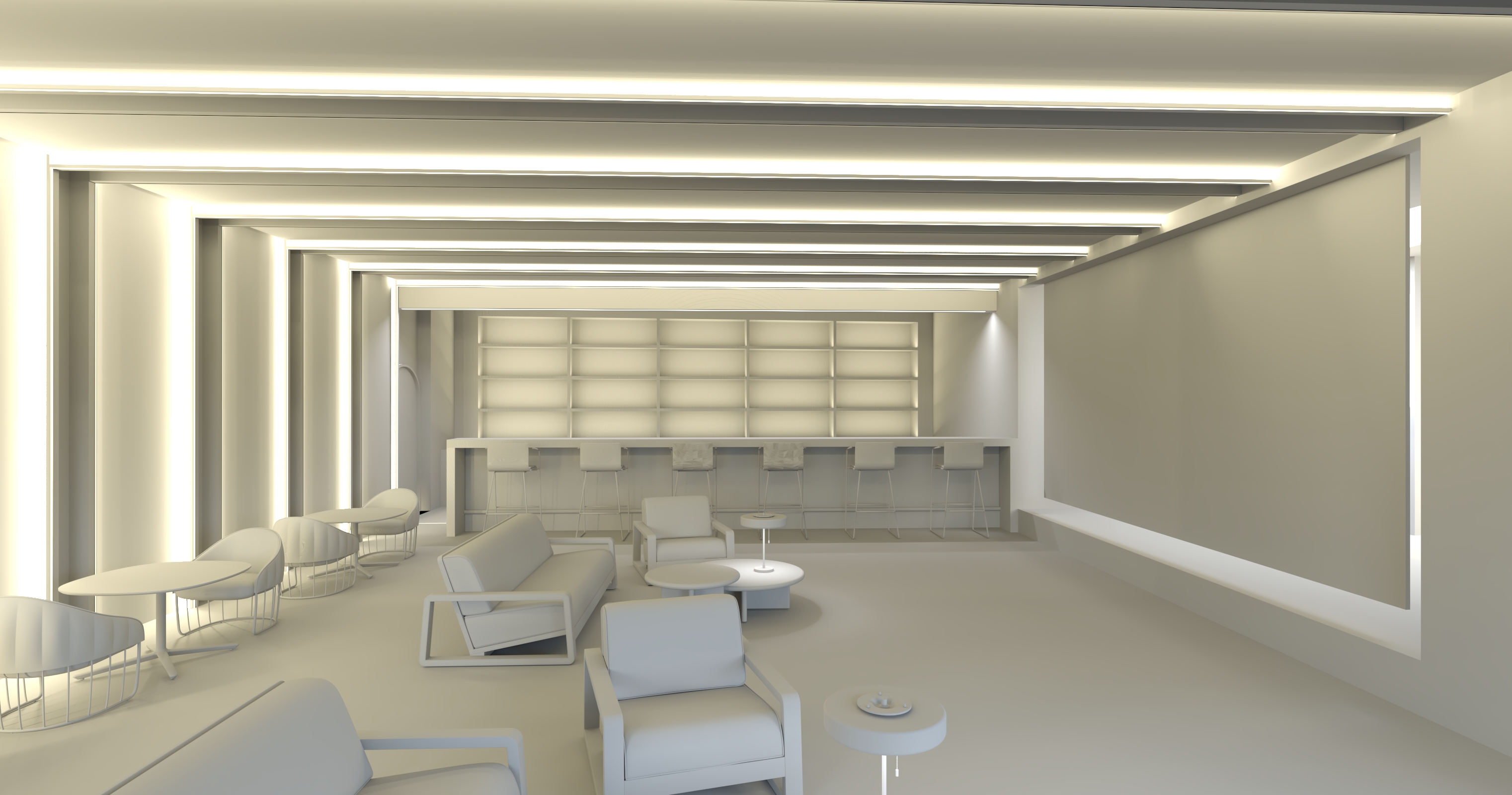 this is a casual theatre with a coffee bar at the back of the room there is a stage to the right with a pull down screen for movies the left wall and ceiling are acoustical panels with led lights and wrapped in a burgundy fabric the space is an eclectic nod to traditional italian theatres it is a sunny day in italy with sunlight pouring in from behind the camera angle