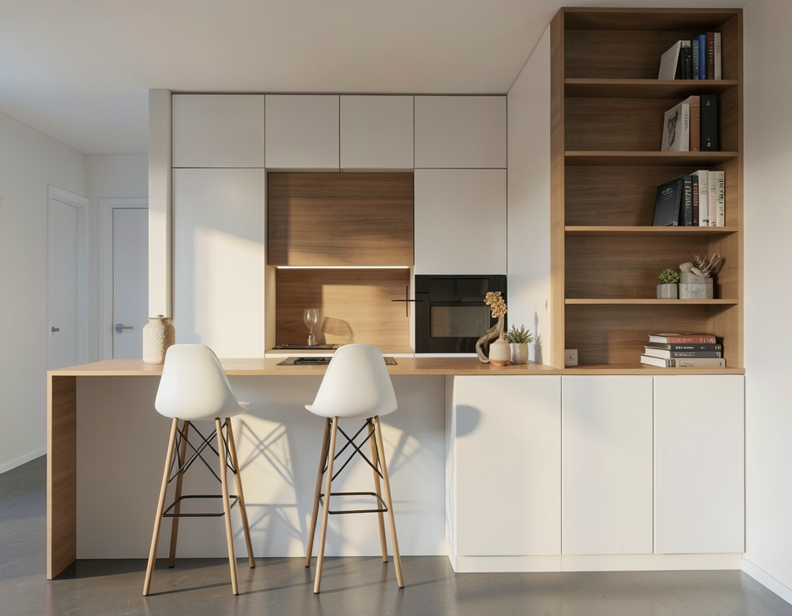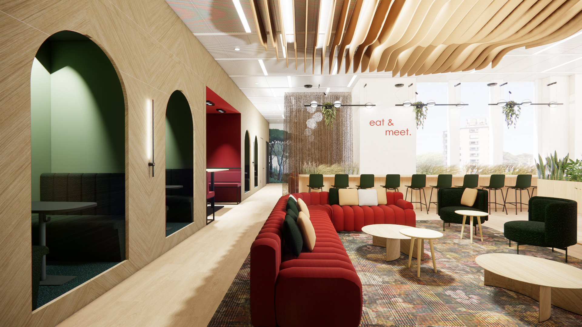 a modern and inviting cafe interior with elegant wooden wall and natural light streaming through large windows the color palette includes warm oak wood tones dark green and deep red the atmosphere is airy and welcoming perfect for relaxation and conversation the place is occupied by a few people