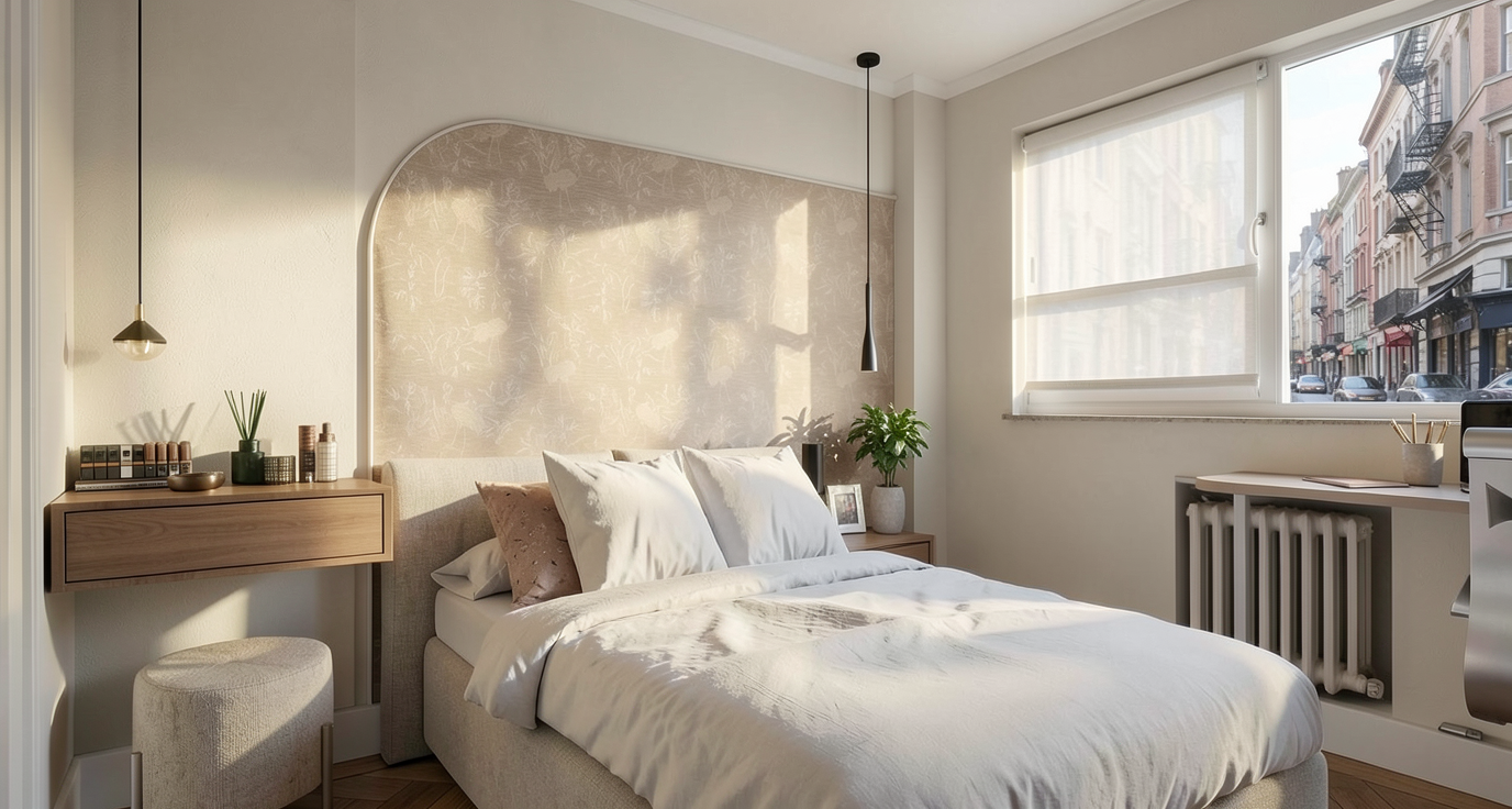 crea una imagen fotorealista a partir de esta de sketchup realza las texturas e iluminacion para que queda todo natural y realista detras del mueble tocador a la izquierda es un espejo hasta el techo