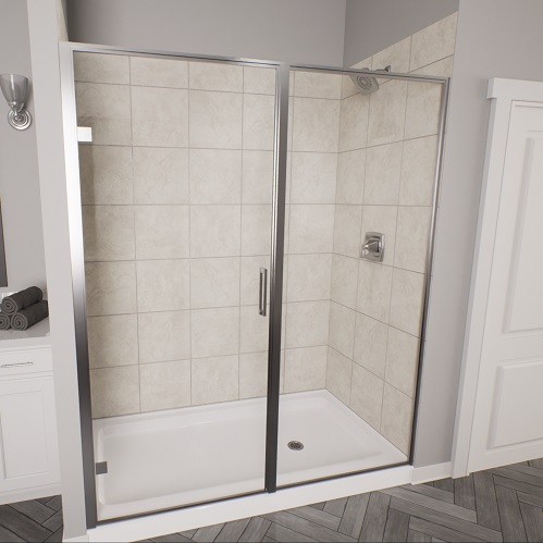 a high end hyper realistic professionally styled real estate photograph of a modern bathroom the scene features strong architectural symmetry and contrast the dominant elements are a large glass panel shower no water spots on the glass