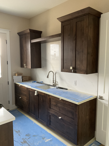do not change the cabinets in any way preserve the exact cabinet colors materials finishes dimensions door and drawer styles hardware spacing alignment and all geometry exactly as shown do not alter the countertop shape backsplash appliances flooring lighting fixtures or wall structure only remove the construction materials clutter and mess from the scene clean the room and make it look finished and staged add a few simple tasteful home accessories appropriate for the style of the space but do not add or remove any furniture windows or architectural elements maintain the original lighting direction and realism enhance clarity and polish the photo while keeping the cabinetry and room design completely unchanged do not alter the lighting to keep the cabinet colors as they are in the image add new flooring stage the countertops and floating shelf for a laundry room add black cabinet pulls to the door and drawer fronts change the door on the left to a full glass patio door