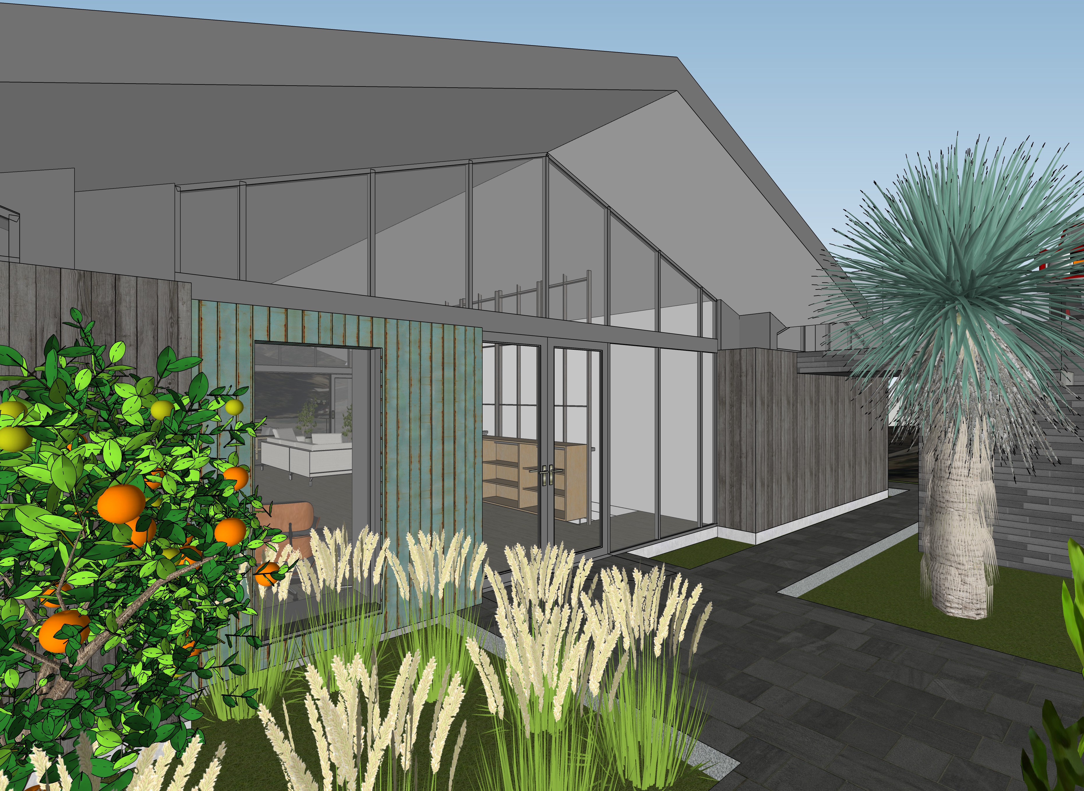 evening view lighting with a sunset sky add a man and woman walking towards the front door dressed for a holiday party add california native plants and grasses to the landscape add some small interior accessories to the bookshelves inside the house make the view off in the distance to malibu lake add a cat sitting on the floor inside the house make the ground and paving damp from fog add a woman inside the house by the sofa holding a glass of wine add a 1972 porsche 911 parked at the right side above the stairs keep the color of the wood siding from the source image