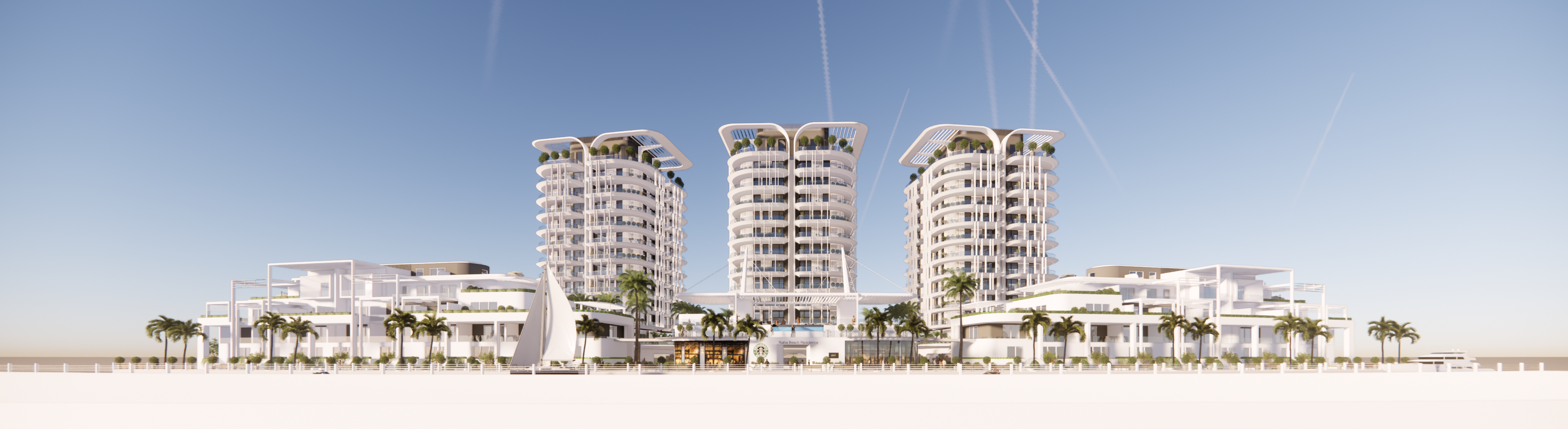 exterior shot three identical residential towers above a strip of beachfront villa condos connected with a bridge on first floor